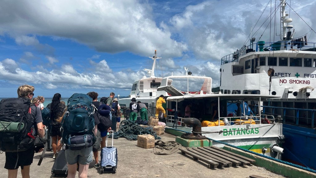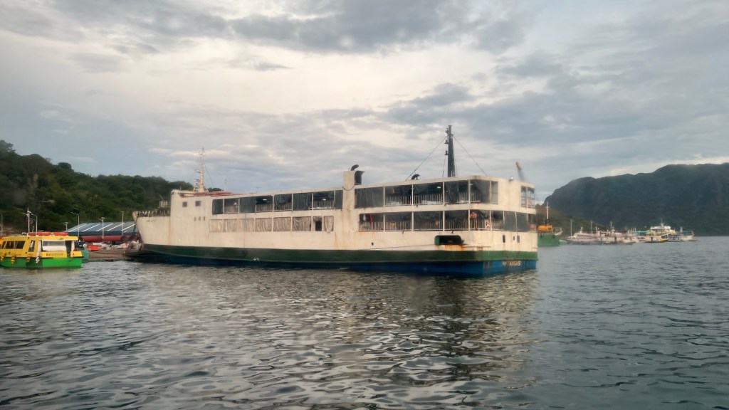 Aus irgendeinem Grund fährt nicht nur die einzige Fähre des Tages um 12 Uhr, sodass man die beste Zeit auf See verbringen muss, sondern muss man auch eine ganze Stunde vor Abfahrt im Hafen sein, ausdrücklich in der Buchung erwähnt. Nach einem kurzen Bäckereinkauf sehe ich, warum. In der Hafenstraße läuft und fährt alles wild durcheinander, lange Schlangen mit Touristen bilden sich vor offiziellen Gebäuden. Habe ich schonmal die philippinische Bürokratie erwähnt? Natürlich muss ich wieder zurück in die Stadt, um mir für meinen Handy-QR-Code ein weiches, gelbes Ticket in die Hand drücken zu lassen. Für einen Stempel darauf muss ich an anderer Stelle 20 Peso (0,30€ Hafengebühr zahlen und an wieder anderer Stelle durch eine Sicherheitskontrolle, bei der aber kaum jemand darauf achtet, ob man nicht einfach an der Seite vorbeigeht. Ein Warteraum ist massiv überfüllt, man kann sich vorbelastet Gepäck kaum bewegen. Alle fünf Sitze wird ein Platz für Schwangere oder Alte freigehalten, viel mehr als nötig. Zwei verschiedene Fährdienste kämpfen um Passagiere, ich halte es seit Buchung mit den „Montenegro Shipping Lines“. Soldaten, oder zumindest Menschen in entsprechender Uniform, helfen, das Gepäck im hinteren Schiffsteil zu verstauen. Seit dem Gespräch mit Diggi muss ich immerzu an Korruption und Geschäftsmanipulation denken. In El Nido habe ich übrigens auch ein Büro zur Wählerregistrierung gesehen, und einen Schriftzug: „Petition for the end of violence on women“. So, als ob man nur abstimmen müsste, um Gewalt an Frauen zu beenden. Aber ja, bei den Touris kommt es bestimmt gut an. Genauso wie manche Aushängeschilder, die nein zu Einwegplastik sagen. Ich lach mich tot. Dabei ist die Situation sogar ein bisschen besser als in Taiwan, meine Brötchentüte habe ich bspw. in Papier bekommen. Okay, auch dadrin sind zwei Sachen in Plastik eingepackt, aber das verstehe ich. Kurzer Gedanke zur Bäckerei noch: Bei der hastigen Bestellung habe ich hinterm Tresen erhaschen können, wie die Frau meine Zimtschnecken mit bloßer Hand eingepackt hat. Weil ich gestern bei der selben Dame schonmal etwas bestellt habe und es mir noch gut geht, sollte objektiv alles in Ordnung sein, aber ein bisschen dreht sich mein Magen dabei schon um. Andere Länder, andere Sitten.