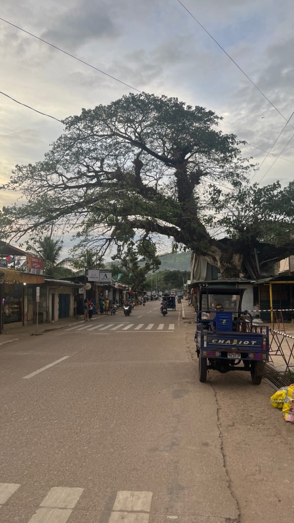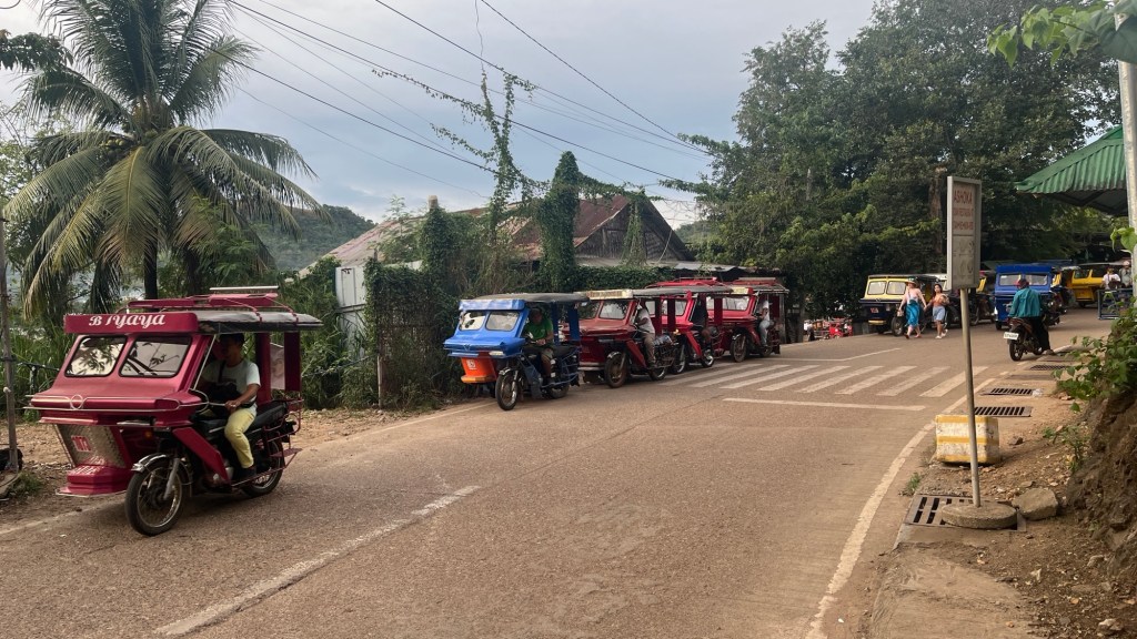 Ich bin schon recht geübt im Abwimmeln, deshalb stellt der Hafenausgang kein großes Problem dar. Nach so vielen Sitzstunden kann ich auch mal laufen. Nur andere Touris, die sich leichter ausnehmen lassen, versperren mir unwillentlich den Weg. Auf einer langen, teils sehr matschigen Hauptstraße laufe ich dem letzten Tageslicht entgegen. Dominiert wird das Geschehen fast ausschließlich von Motorraderweiterungen, hierbei handelt es sich aber um asymmetrische Modelle, wo dem Motorrad eine Art Beifahrerwagen angehängt wurde, im Gegensatz zu den symmetrischen Wägen auf Camiguin.