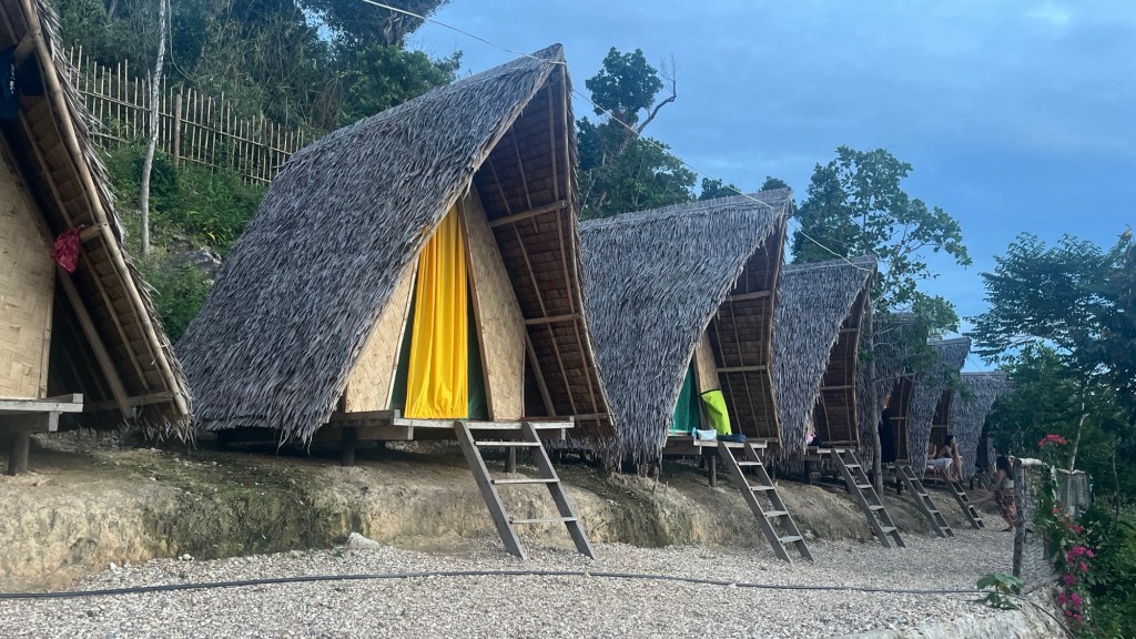 In der finalen Bucht liegt eine Insel, deren Hang beidseitig mit kartenhausförmigen Hütten besetzt ist. Zum ersten Mal ist die Gruppe für sich alleine, jeder bekommt ein traditionelles Holztipi zugewiesen, in denen jeweils zwei Matratzen liegen. In der Gegend dürfen wir nicht mehr schwimmen, wegen des erhöhten Aufkommens an „jellyfishes in the mangroves“. Gnädigerweise lässt mich der Chef dann doch noch an meinen Rucksack, wofür eine Klappe im Boden weggeräumt werden muss. Zahnbürste, Kontaktlinsenflüssigkeit und eine Unterhose sollten reichen, um die nächsten Tage zu überleben. Es gibt vor Ort sogar Duschen und Toiletten, wobei man vermehrt mit Wasserkübeln arbeiten muss.