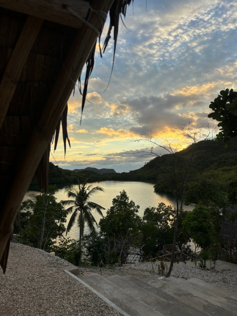 Nach längerer Pause wird unten am Wasser aufgetischt, das Prozedere mit Präsentstion und Klatschen ist wieder dasselbe. Es gibt zwei gigantische Fische, frittierte Auberginen, jede Menge Fleisch, „Filipino power“-Reis, Mangos und natürlich: Rumcola. Daydrinking doesn‘t stop at night, stimmts? Ich sitze zwischen zwei Gruppen und verliere mich zwischen den Konversationen. Links die jüngeren, im Regen Austausch über Sprachen, rechts die älteren, irgendwelche erwachsenen Themen, Organspenden und so. Beim Reden fällt mir auf, wie ich teilweise selbst schon sehr in eine Imitation des Wiener Dialekts verfalle, Spiegelneuronen hallo. Nach einer halben Stunde wird strikt abgeräumt, und mir fällt auf, wie wahnsinnig viel davon übrig bleibt. Was mit den Resten passiert, oder besser gesagt nicht passiert, mag ich mir gar nicht vorstellen. Wir sitzen jetzt in kleinen Grüppchen und ich lasse mir von Emma erzählen, dass sie Französisch, Englisch und Deutsch alles gleich gut spreche. Philippinisch probiere sie jetzt seit drei Wochen und ich lerne ein paar neue Wörter: „Tubig“ heißt Wasser, „Hindi“ bedeutet Nein und „Opo“ meint Ja. „Ja, mit den Locals chillen ist das einzig Wahre“ sagt sie, bei dem Wort „Locals“ wird ihre sowieso tiefe Stimme noch rauchiger. Apropos Rauch, ich muss einmal erwähnen, wie sehr Emma, aber vor allem die drei Spanierinnen am vapen sind, das ist wirklich nicht mehr normal. Den ganzen Tag stinkt die Dampfmaschine, immer mal wieder sieht man kleine Wölkchen aufsteigen. Dass das so viel besser als Rauchen ist, stelle ich anhand der erhöhten Intensität mal infrage.