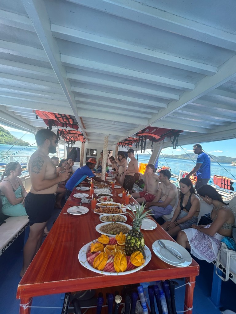 Am nächsten Spot gibt es dann Mittagessen. Die großen Holztische werden gedeckt, in der Mitte finden unzählige Platten Platz. Es gibt Fruchtsaft, frittierte Garnelen mit thousand island sauce, noch mehr Fleisch und Gemüse, eine fruchtige Nachtischplattr, Reisnudeln und natürlich: Reis. Einer der beiden Köche stellt das Festmahl Punkt für Punkt vor und stimmt uns auf einen Sprechchor ein. Nach jeder angekündigten Speise trommeln alle mit ihren Fingern auf die Tischplatte und rufen: „Yamyamyam!“ Die Krönung bildet der Reis, der offensichtlich das simpelste ist, auf den die Filipinos aber sehr stolz zu sein scheinen. „Last but not least… Filipino… power!“ Das „power“ schreien alle mit und heben die Hände nach oben. Dann wird für den Koch und die Crew geklatscht und das Büffet ist eröffnet.