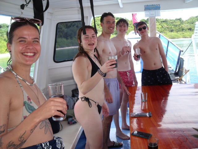 Gegen 16, 17 Uhr bricht die dritte Flasche Rum an, nachdem wir schon eine kurzzeitige Sperre kassiert haben. Wir rotieren die Trinkspiele, unter anderem wird „100 questions“ gespielt, nicht gerade mein Favorit für neue Gruppen. Da man sich nicht kennt, kommen die oberflächlichen Bewertungen noch gemeiner rüber und wenige Personen polarisieren, quasi jede zweite Karte wird an Lucas verwiesen. Trotzdem haben sich die Spanierinnen (verständlicherweise) zurückgezogen, führen conversación vorm Bug. Mehr als ein paar Sätze haben wir auch aus den Britinnen und der Niederländerin nicht herausgekriegt, aber der Londoner Matt scheint cool zu sein. Die Filipinos würden ihn immer Max nennen, was Lucas prompt zum Anlass nimmt, es ihnen gleichzutun. Matt und die Niederländerin Lina haben sich auf Sri Lanka kennengelernt und reisen immer mal wieder zu zweit, so auch aktuell. Die beiden Britinnen kommen aus Nottingham, wirken wie ca. 30, arbeiten wohl als Anwältinnen und haben den hochnäsigsten Akzent der ganzen Gruppe, was sicherlich nur ein Vorurteil ist. Am nächsten Strand lässt Marius seine persönliche Drohne steigen, das passt zu dem Bild, was er in den ersten Stunden präsentiert. Etwas schlecht gelaunt, nicht allzu gesprächig, außerdem nerdig verwöhnt, so wie er sein Privatspielzeug fernsteuert. Er und Franzi sind auf jeden Fall die ältesten und würden sich in einer Gruppe mit höherem Altersdurchschnitt wohler fühlen, da bin ich mir sicher. Franzi versucht es wenigstens mit der Konversation, mal erfolgreicher, mal weniger erfolgreich.