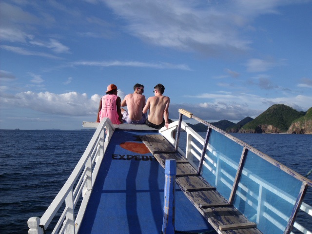 Nach dem Essen bekommt Emma den Chef überredet, die erste Flasche Rum rauszuholen, es ist wohl an der Zeit. Wahrscheinlich punktet sie mit ihren rudimentären Filipino-Kenntnissen, jedenfalls wiederholt sie die jeweiligen Schlüsselwörter so oft, bis sich der Langhaarige genug geschmeichelt fühlt, um ihrem Charme nachzugeben. „Lasing lasing!“ steht wohl für Betrunkensein. Weshalb die Deutschsprachigen die Tour gebucht haben, merke ich schon. An sich ist das Gruppengefüge auch ganz lustig und weil die anderen es tun, mache ich irgendwie auch mit. Ich warne aber vor, meine Toleranz geht gegen Null, während die anderen Deutschen schon jede Menge Saufgelage hinter sich haben. Auf dem Deck diskutieren wir, wie man jetzt richtig Busfahrer spielt und leeren parallel die erste Flasche Rum. Für die Briten und die Niederländerin tut es mir etwas leid, dass alle Deutsch reden, aber alleine auf Englisch zu schalten, ist wie gegen eine Wand zu reden. Am Nachmittag stelle ich fest, dass ich vergessen habe, im Vorhinein ein Einführungsvideo zu schauen. Mit meiner Unterschrift heute früh habe ich nämlich bestätigt, bis übermorgen nicht an mein Hauptgepäck zu müssen, was eine mittelschwere Katastrophe wäre, angesichts der spärlichen Ausstattung in Form meiner Bauchtasche, mit der ich gerade unterwegs bin. Aber naja, minimalistisch lebt sich‘s auch irgendwie.