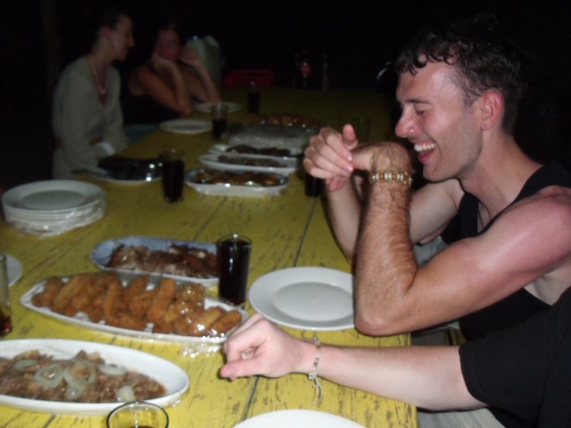 Am nächsten Spot gibt es dann Mittagessen. Die großen Holztische werden gedeckt, in der Mitte finden unzählige Platten Platz. Es gibt Fruchtsaft, frittierte Garnelen mit thousand island sauce, noch mehr Fleisch und Gemüse, eine fruchtige Nachtischplatte, Reisnudeln und natürlich: Reis. Einer der beiden Köche stellt das Festmahl Punkt für Punkt vor und stimmt uns auf einen Sprechchor ein. Nach jeder angekündigten Speise trommeln alle mit ihren Fingern auf die Tischplatte und rufen: „Yamyamyam!“ Die Krönung bildet der Reis, der offensichtlich das simpelste ist, auf den die Filipinos aber sehr stolz zu sein scheinen. „Last but not least… Filipino… power!“ Das „power“ schreien alle mit und heben die Hände nach oben. Dann wird für den Koch und die Crew geklatscht und das Büffet ist eröffnet.
