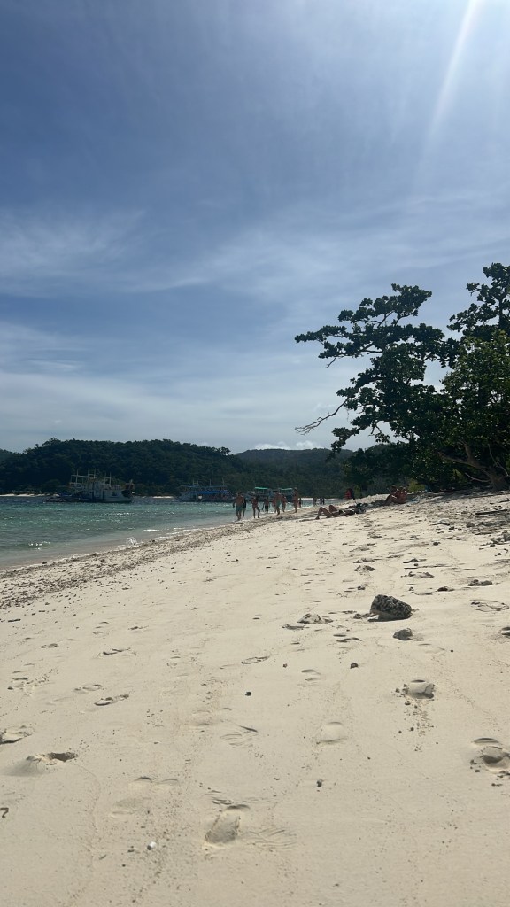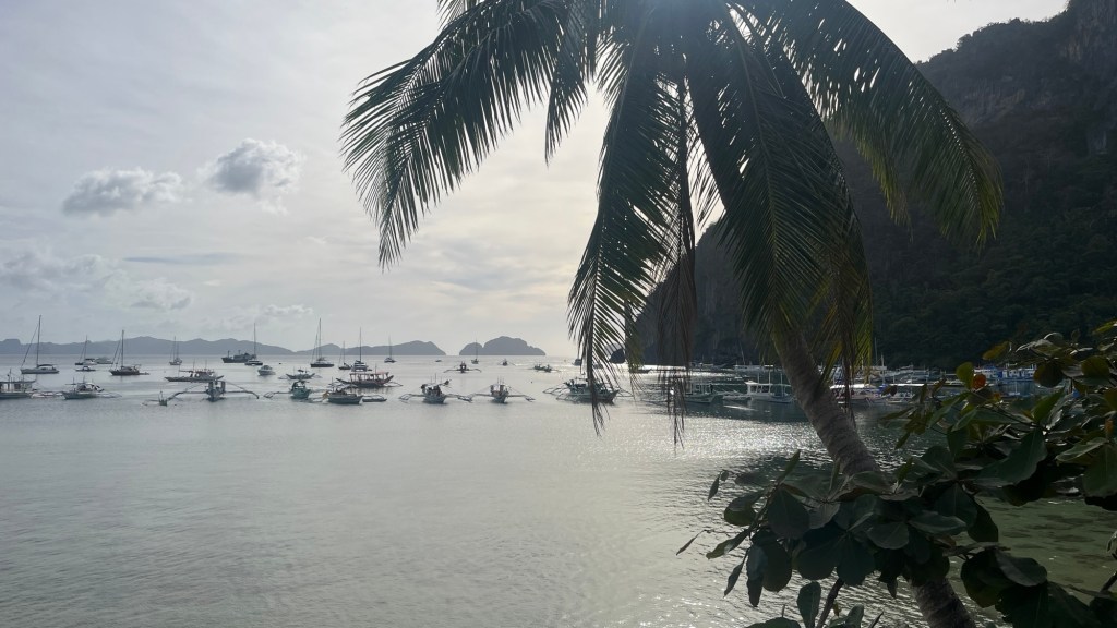 Sofern möglich, will ich schon heute Abend nach Puerto Princesa zurückkehren. In El Nido erwartet mich nichts Neues, zudem ist es vergleichsweise teuer, und sicherheitshalber früher am Flughafen zu sein, kann auch nicht schaden. Einen Bus muss ich dafür aber spontan suchen. Erstmal legt sich das halbe Boot schlafen, während wir zum ersten Spot fahren. Dass die Sonne wieder scheint, ist natürlich ein glücklicher Umstand, aber auch gefährlich hinsichtlich der UV-Gefahr. Bald erreichen wir den ersten Spot des Tages und wie kaum zu erwarten, gibt es hier nicht nur Fische und Strand und Palmen, sondern auch Korallen! Das ist so einzigartig, dass nochmal 200 Peso (etwa 3€) Gebühr fällig werden (in den letzten Tagen gab es immer mal spontane Zusatzgebühren für besondere Strände). Ich entledige mich meines Verbandes und werde dann doch nur im Kayak transportiert, denn auch hier gibt es Jellyfische. Da ich noch ohne Sonnencreme unterwegs bin, finde ich mich unter einer Palme ein und bestaune die abgestorbenen Korallen, mitsamt getarnter Bewohnerkrebse. Wie werden die eigentlich so steinern und schwer? Ist das so ein Verwesungsprozess? Es dauert nicht lange, bis auch die drei Spanierinnen, Matt und die beiden Ösis dazukommen. Nur 40 Minuten haben wir hier, die wollen entspannt genutzt werden. Ehrlich gesagt wäre es bestimmt besser, weniger Spots mitzunehmen und dafür an ihnen umso mehr Zeit zu verbringen. Ein anderer Ösi, Teilnehmer einer benachbarten Tour, den wir schon gestern Abend an der Bar gesehen haben, gesellt sich kurz dazu. Nachdem er weg ist, bezeichnet Lukas ihn als Zigeuner, ein ziemlich inflationär verwendetes Wort der beiden.