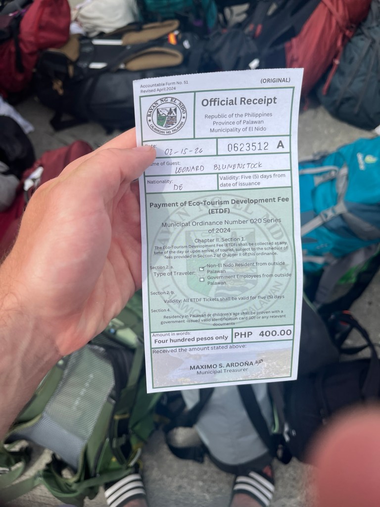 Wegen der Motorenprobleme (für die zwei Crewmitglieder in den Maschinenraum absteigen und dort werkeln müssen) lassen wir den letzten Spot aus und steuern direkt den Zielhafen an. Zwei Schönheitsfehler: Erstens heißt die Tour „Coron – El Nido“, dabei sind wir noch eine ganze Weile von El Nido entfernt (nämlich in der „Darocotan Bay“), das empfinde ich schon als leichten Betrug. Außerdem werden wieder irgendwelche Extragebühren fällig, für den Hafen und für ein passiertes Naturschutzgebiet oder so. So oft, wie man obendrauf zahlen muss, fühle ich mich langsam echt, als würde man uns schamlos abziehen… Ahja, eine Trinkgeldbox gibt es auch noch, aber in die schmeiße ich mein Geld wenigstens gerne. Über das, was die Tour bietet und wie manche Dinge organisiert sind, kann man viel sagen, aber die Crew war echt sehr cool und entspannt drauf. Mit Leo bin ich mir einig, dass es gut war, die Tour zu machen, dass wir sie aber beide kein zweites Mal buchen würden.