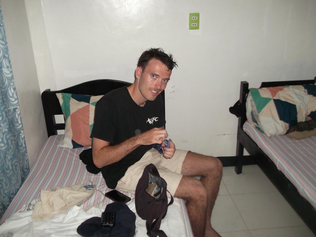 In El Nido verabschieden wir drei Jungs uns also von den meisten Teilnehmern und laufen die Hostels ab, Stück für Stück, von Tür zu Tür. Ich bleibe immer draußen, weil die Chance für ein Doppelbett größer ist, wenn man zu zweit fragt. Beim vielleicht siebten Versuch klappt es dann sogar auch. Das Hostel liegt erstaunlich gut, direkt an der Hauptstraße, mit bewaffnetem Security-Mann davor und so wie die beiden es erzählen, hat sich der Betreiber erst dann „erinnert“, dass eines seiner vier Obergeschosszimmer doch noch frei ist, als die beiden gesagt haben, sie würden quasi alles nehmen. Zusammen erkunden wir das Prachtstück an Wohnraum und müssen feststellen: Bei normalen Kunden hätte es der Reputation des Gasthauses wohl wirklich geschadet, das Zimmer zu vermieten. Inklusive Frühstück bekommen wir zu dritt für 30€ einen Raum mit Einzel- und Doppelbett, die jeweils aus einer Holzplatte und Matratze bestehen. Das Bad ist aber der Gipfel der Unvermietbarkeit: Schon ohne dass die Tür geöffnet ist, riecht man die Schimmelhölle in Reininkarnation. Es ist kaum möglich, ohne Luftanhalten mehr als zwei Minuten dort zu verbringen, so eindringlich ist der Gestank. Da ist es fast nur Nebensache, dass die Toilette keine Klobrille besitzt, die rostige Duscharmatur bei Berührung fast abfällt, das Wasser kaum als durchsichtig durchgeht und man nur spülen kann, indem man kräftig schaufelt. Ein Waschbecken, dass zusätzlich im Schlafzimmer steht, bekommen wir nach einmaligem Anstellen nicht wieder aus, zudem riecht das Wasser dort so extrem nach Eisen, dass ich mich fast fürchte, mein Gesicht damit nass zu machen.
