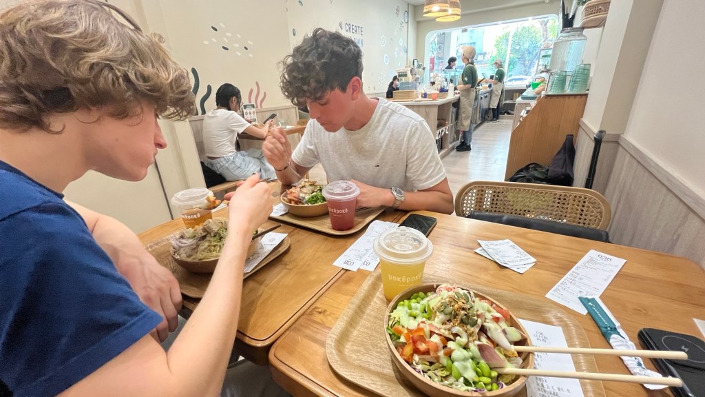 In Zuoying steht der Bus wegen einem Passanten lange schräg, dann entlässt er uns in die Kaohsiunger Hitze. Hier trubelt immer noch der Markt von letztens, in Kaohsiung ist gut was los. An der Arena steigen wir aus und laufen zur „PokéPoké“-Bowl, ein überaus passender Laden für unseren Herr Veganer. Auf dem Weg entbrennt ein kleiner Kulturkampf über die 4-Tage-Woche mit m.E. sehr guten Argumenten auf Oskars Seite, ohne großen Groll geht es zum Essen. Ein modernes Bestellverfahren und etliche, gemüsige Beilagen treiben die Freude in die Höhe. „Zuhause zahle ich dafür locker das Dreifache!“ freut sich Oskar. „Allein den Bon zu sehen, macht mich so glücklich. Alles, was ich hier spare, kann ich dann in Deuschland extra ausgeben.“ Die Rechnung geht fast auf. Dazu ist das Essen auch wirklich gut, so etwas würde ich mir in Deutschland wirklich nicht holen. Also genießen, solange möglich.
