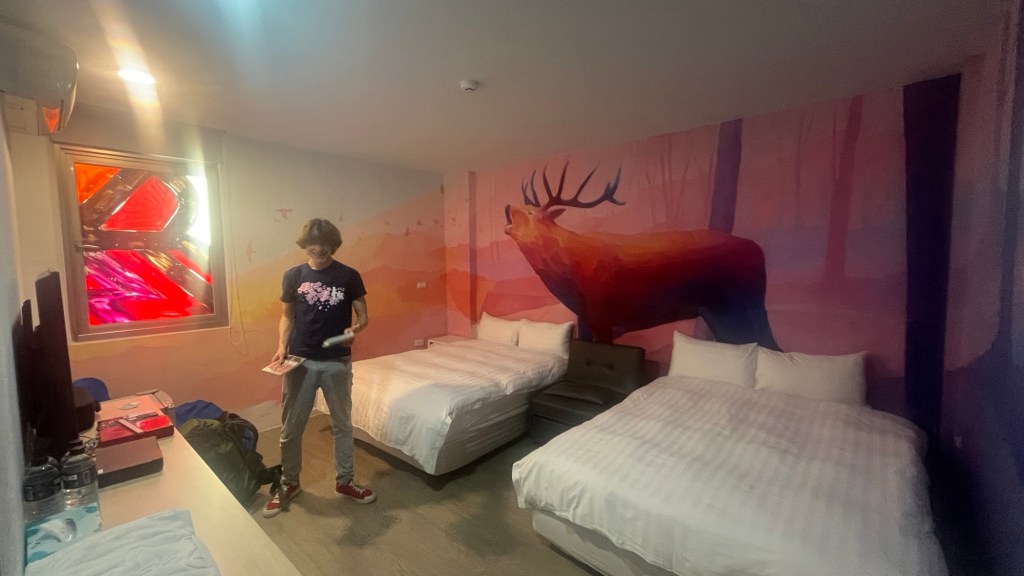 Weiter geht’s mit der Red Line, am Formosa Boulevard steigen wir aus. Der „Dome of Light“ fasziniert erwartungsgemäß nur ein bisschen, beeindruckender kommt da schon rüber, wie in der Metro-Station ein Markt stattfindet, belebt besucht wird und quasi kein Müll oder Dreck zu sehen ist. In einer Seitenstraße, etwa zwanzig Meter von meinem allerersten AirBnB entfernt, liegt unser Hotel für die nächsten drei Nächte. Im „Start Hotel“ sitzt aber niemand, die Sprechanlage verspricht nur, dass gleich jemand vorbeikommt. Trotzdem können wir schon rein, bis zum Aufzug und auch mit Blick hinter den Tresen, der mehr einer Abstellkammer gleicht. Schließlich kommt ein älterer Herr vorbei, telefonierend und ohne uns eines Blickes zu würdigen. Nach einer Weile Rumkramen gibt er uns eine Zimmerkarte. Am Brett daneben ist zu sehen, dass alle restlichen Karten nicht vergeben sind, offensichtlich sind wir die einzigen Gäste. Entgegen aller Hoffnung lässt sich mit Karte zahlen, nur die Bedienung des Geräts verlangt dem Herrn einige Hirnpower ab. „Er sieht nicht gerade aus, als würde er das öfter machen“, findet Oskar. „Vermutlich denken die sich jetzt: Scheiße, da will tatsächlich jemand in unserer Geldwäsche einmieten.“ Lustiger Gedanke, aber ich vermute eher, dass das Geschäft nur semi läuft und die Betreiberin ihren Kumpel aushelfen lässt.