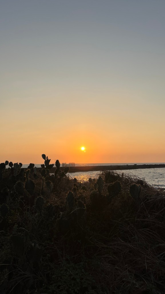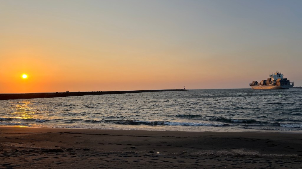 Trotz wolkenfreiem Himmel wollen wir mehr: Durch den obersten Hügelzipfel von Cijin führt ein Spaziertunnel, vor dem ein Flötenspieler sitzt, hinter dem eine roughe Felsenlandschaft wartet, sowie die nördliche Hafenmole und weiterhin guter Ausblick nach Westen. „Die Kakteen, die Kaktussen kommen krass“, Julius macht viele Fotos. An einer ruhigeren Stelle brechen wir vermutlich die Nicht-Betreten-Regeln jenseits des Weges, allerdings laufen nur 50 Meter weiter einige andere Leute ebenfalls auf einem Strandabschnitt. Von hier aus beobachten wir ein ausfahrendes Containerschiff und rätseln, ob es Konsumgüter oder Mikrochips in die westliche Welt verfrachtet.