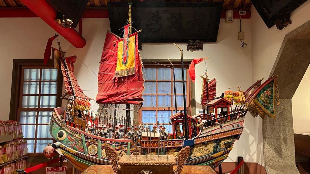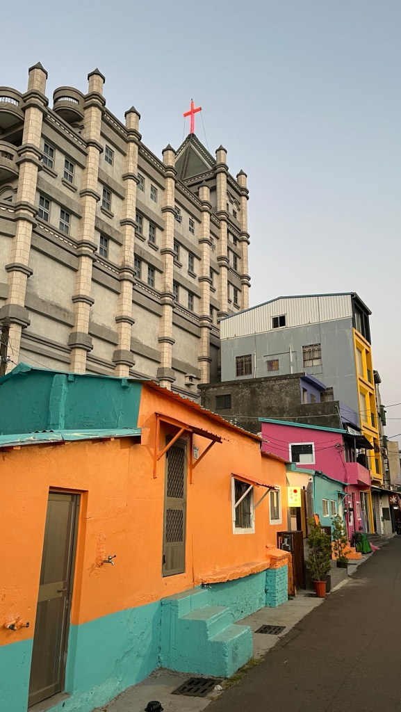 Recht bald geht es weiter, die Sonne gönnt nicht mehr so viel Tageslicht. Schnell EasyCards aufladen, dann fahren wir mit der Orange Line nach Hamasen. Durch das Hafenviertel, das mich vor allem an meine Anfangszeit hier erinnert, laufen wir zum Gushan’er Fischmarkt und kurz auf den Pier, wo das gelbe U-Boot steht, farbige Hauswände das Ufer schmücken und Kiesinseln eine winzige Landschaft formen. Als Nächstes besteigen wir die Fähre, die zwar etwas wackelt, aber nicht einmal ansatzweise ein Vorgeschmack auf diejenige nach Lü Dao ist. Auf Fahrtmitte hat man einen sehr guten Blick auf die Skyline, die vor allem durch den gliedähnlichen „Sky Tower“, das „Kaohsiung Music Center“ und die Messehalle geprägt ist, abgesehen von allem Krimskrams des Hafens selbst. Ob mir von Anfang klar war, dass ich im Marseille Taiwans wohnen werde? Nicht ganz, und mein Vergleich zieht sich auch eher mit Hamburg, aufgrund der Yachtwerften etc. Aber das Klima stimmt natürlich schon, und auch die Palmen, die man in der Ferne auf dem Affenberg spottet, drängen den vorigen Vergleich auf. „Ein Hafen oder irgendeine Form von Gewässer geben einer Stadt gleich so viel Charakter“, stellt Oskar treffend fest.