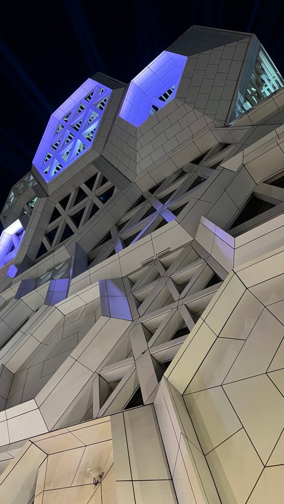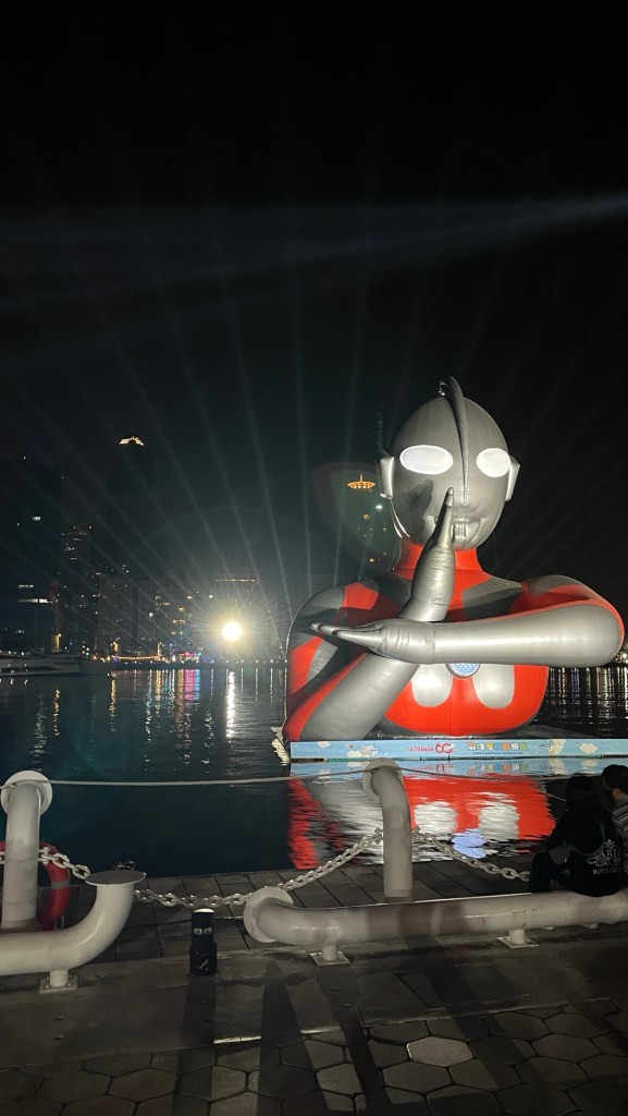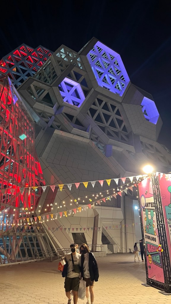 Auf der „Great Harbour Bridge“ schauen wir aus näherer Position auf das Musikzentrum in Bienenwabenform und überlegen, wann sich die Brücke immer dreht. Zu festen Uhrzeiten oder wenn jemand einen Termin dafür bucht? Weiter geht’s bis zum Musikzentrum selbst, wo viele Leute stehen, gehen, reden und ihren Abend genießen. Auf dem Wasser ist eine überdimensional große „Kamen Rider“-Figur, die unzähligen Himmelsscheinwerfer kommen übrigens auch von hier. Oskar erzählt von seinem früheren Jugendlichen-Leben in der Welt der Videospiele und stellt eindrucksvoll sein Fachwissen zur Schau. Julius ist langsam genervt, uns im Schneckentempo zu begleiten, also erweisen wir ihm die Gnade und holen uns selbst zwei Räder.