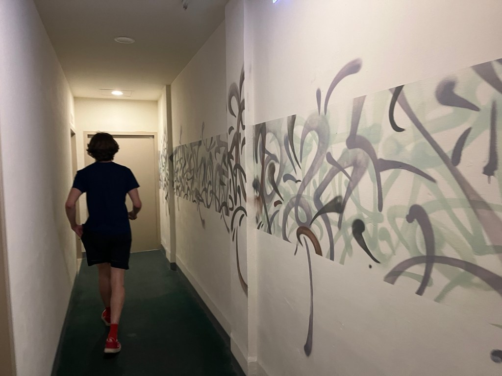 Wie vorhergesagt sind sämtliche Zimmer im 5th floor (wegen Auslassung des 4th floor eigentlich nur der dritte Stock) leer, und bleibt das Zimmer am Ende des Ganges mit zwei französischen Doppelbetten. Die Hoteldekoration nenne ich mal mutig: Im Flur gibt es Tag-Graffiti, das an Lost-Place-Graffiti erinnert, auch unser Fenster in von außen zugesprüht. Immerhin die Wand ist leicht kitschig, aber nett angemalt. Im Bad stinkt es, allerdings deutlich weniger als bei meiner Philippinen-Erfahrung in El Nido, und das Beste kommt noch: „Wir haben eine Wii!“ schreit Oskar.