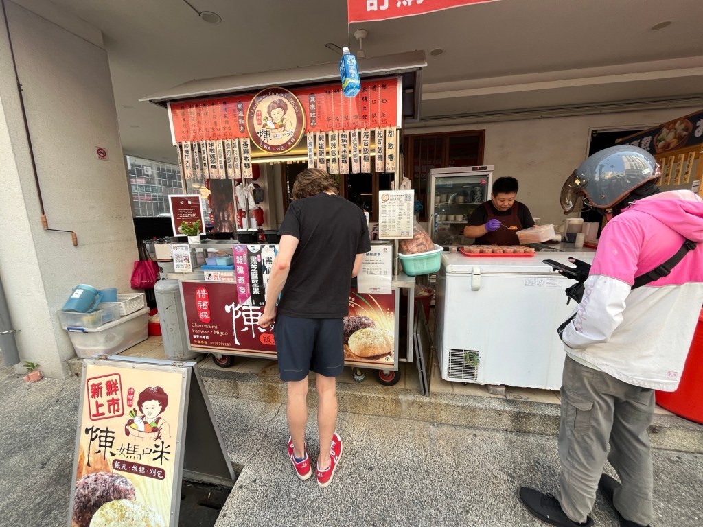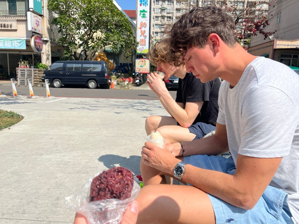 So oder so kommt es nicht so weit, Oskar hat nämlich schon jetzt Schulden bei einem taiwanesischen Unternehmen aufgebaut: Seine Kreditkarte ist leer und hat die letzte YouBike-Fahrt nicht bezahlen können. Neues Geld gibt es erst morgen, nach dem Wochenende, deshalb fahren wir dann dich Metro. Aussteigen tun wir schon in Aozihdi, in der Nähe findet sich nämlich einer der Reisbällchenstände, die mir von Junwei aus Tainan empfohlen wurden. Ganz entspannt bestellen wir jedem, was ihn eben anspricht, auch für Oskar gibt es irgendwas mit Soja. Ergänzt durch aufputschende Getränie aus einem 7/11, setzen wir uns in einen überaus versiegelten Park, die Rentner haben sich bereits alle Schattenplätze gesnackt. In der schon jetzt knallenden Hitze vertilgen wir das taiwanesische Frühstück, während Schlenni die unendlichen Fliesenfassaden der Stadt immer mehr ins Auge stechen. Dass wirklich jede einzelne Hauswand damit versehen ist, muss einem auch erstmal in den Kopf gehen.