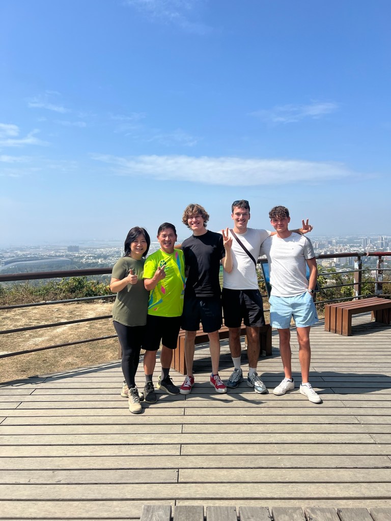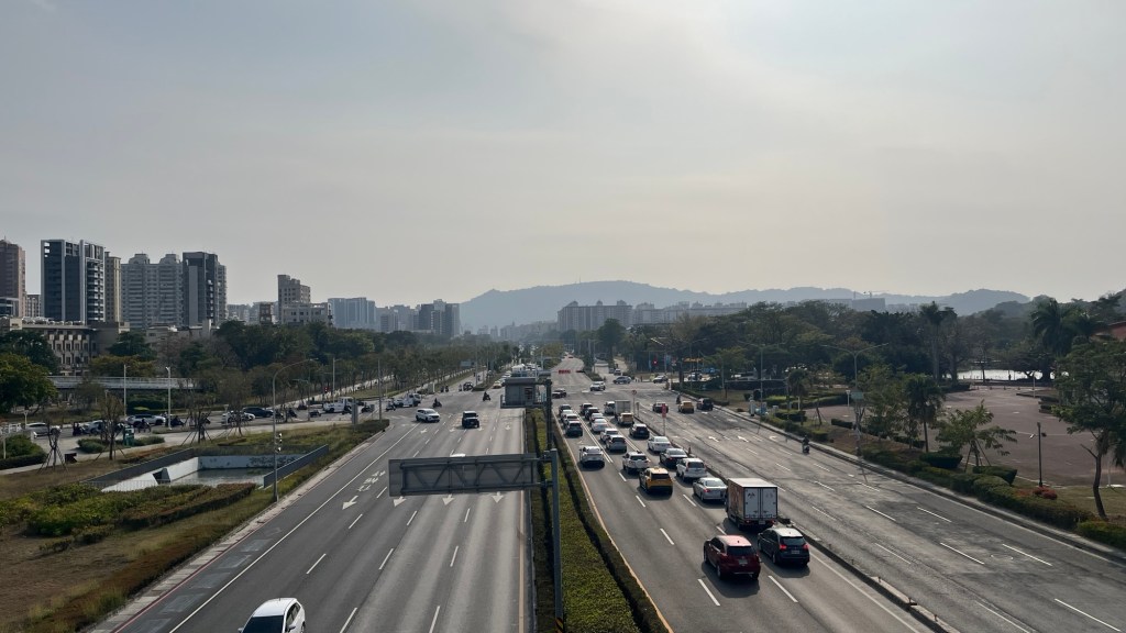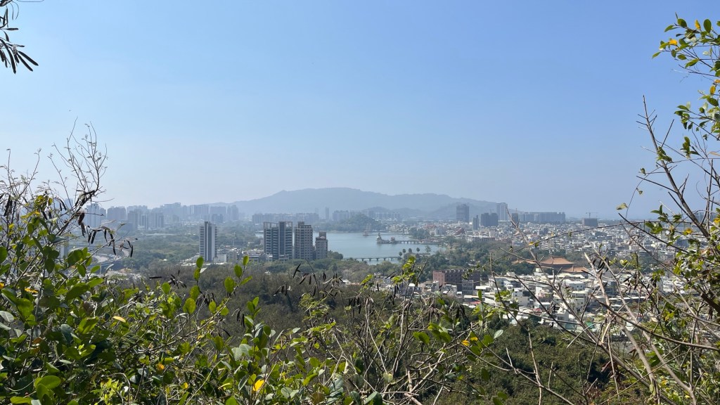 Der Banpingshan (unser erster Tagespunkt) präsentiert sich als trockene, sonnige und vor allem ruhige Stadtoase. Der angelegte See am Rand ist fast leer, vielleicht von TSMC ausgepumpt? Die einzigen Begegnungen finden mit wandernden taiwanesischen Rentnern statt, die allesamt Sonnenschutzkleidung tragen und über ihre Handylautsprecher Musik hören. Zwischendurch gibt es Blicke auf den Lotus Pond, aber auch nach Westen aufs Meer und auf die mal mehr, mal weniger organisch gewachsenen Stadtviertel. Im spärlichen Schatten lässt es sich geradeso aushalten, gerade weil wir uns ja die sonnigste Zeit des Tages ausgesucht haben. Ganz oben lassen wir die Blicke einmal schweifen, schauen auf die „World Games“-Arena, schauen den Miniatur-Metros beim Transfer zwischen den Stationen zu, blicken in den Dunst über Gangshan und hören die graue gestreifte TSMC-Fabrik nebenan. „Warum baut man das mitten in der Stadt?“, fragt Julius. „Obwohl, von irgendwo müssen die Arbeiter ja kommen.