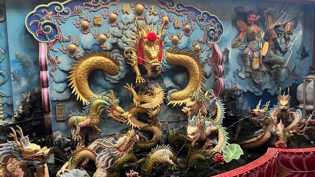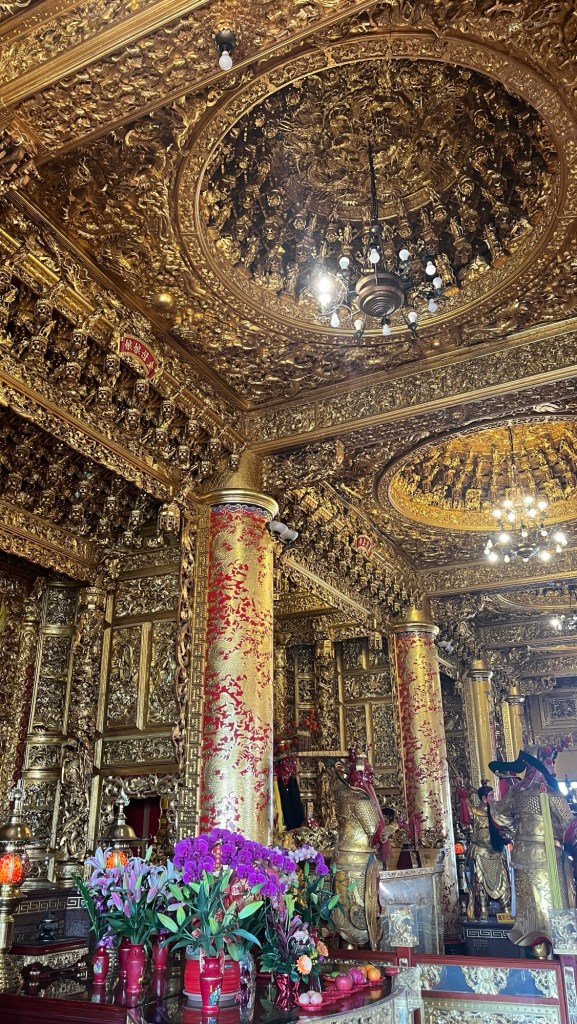 Oskar hätte Hunger gehabt, weshalb ich mich etwas schlecht fühle, aber vermutlich wären wir mit weiteren Angeboten überschwemmt worden, außerdem war Raymonds Redeanteil für meinen Geschmack deutlich zu hoch. Die Jungs beruhigen mich aber, es sei alles fein. „Wir hatten eine gute Zeit mit ihm und seiner Frau“, sagt Julius. Zudem haben wir nicht mehr ganz so viel Zeit, die Pagoden anzuschauen, bevor es weiter geht. Also holen wir uns ein Teegetränk (Julius traut sich an die 80% Zucker), dann betreten wir den Drachenkopf. Auf der Pagode schauen wir auf die Skyline von Kaohsiung, wahrlich unverwechselbar (nicht). Es ist leise, auch wenn die Stadt generell etwas lauter als Taipei ist. Um den Lotus Pond stehen sehr viele taoistische Tempel, einen davon betreten wir, nachdem wir auch die andere Pagode passiert und im Tigerkopf einen stummen Wunsch geäußert haben. Die rot-goldene Tempelanlage ist wie so oft prunkvoll gehalten, mit Wasserspeiern, Bildnissen an der Wand, kunstvollen Säulen und einem Obergeschoss, dessen Gold eine barocke Kirche alt aussehen lässt.