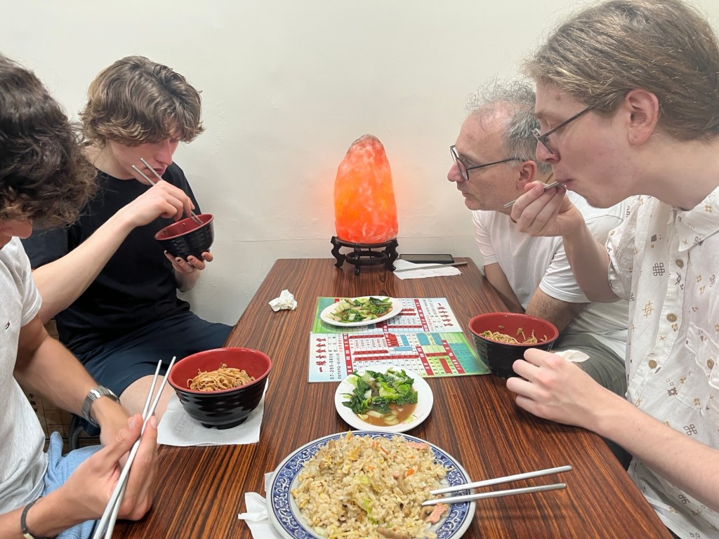 Zum Glück haben alle genug Energie, zum Abendessen noch einmal loszuziehen. Oskar hat ein Veggie-Restaurant rausgesucht, nicht weit vom Liuhe Night Market. Die Bestellung gestaltet sich schwierig, weil die alte Dame schwerhörig ist (ihr Telefon klingt mehrfach ohrenbetäubend). Wir bekommen aber alle nötigen Infos und genießen unsere Nudeln, Unseren Reis. Trinken gibt es nicht, dafür ist es billig und schmeckt.