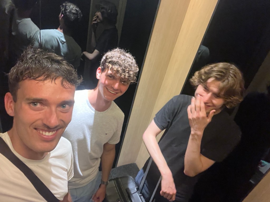 Fabi und seine Freundin gesellen sich später auch dazu und die allgemeine Unterhaltung fließt voran. Ich versuche, nicht zu viel über Leute von hier (Himhim, Hasan, Thurston) zu reden, damit alle einen Anknüpfungspunkt haben. Wir bleiben viel länger als geplant, ich genieße es auch einfach sehr, nochmal mit Fabi und Lina zu quatschen, jeden Biersipp, jeden Moment hier oben. Philipp mit seiner ruhigen, aber total schelmischen Art, wie auch Julius später bemerkt. Jetzt habe ich in kurzer Zeit mehrere Wiener kennengelernt und muss eindeutig sagen, wie sehr mir Wiener Humor gefällt. Sollte ich mal die Chance haben, nach Wien zu ziehen, werde ich kaum ablehnen wollen. Auch Oskar genießt es, hockt auf dem Boden und fragt Kaan über seine Masterarbeit aus.