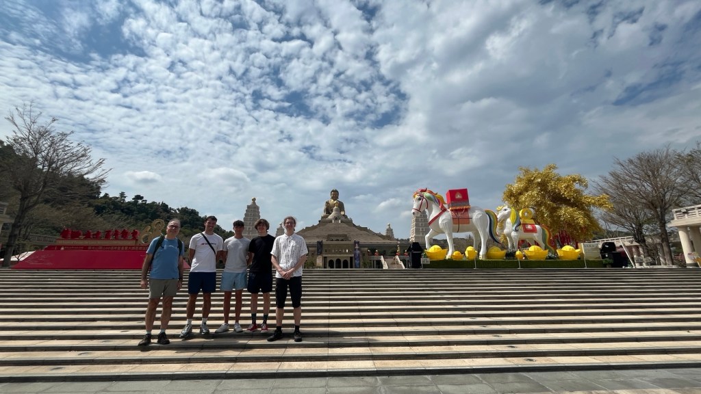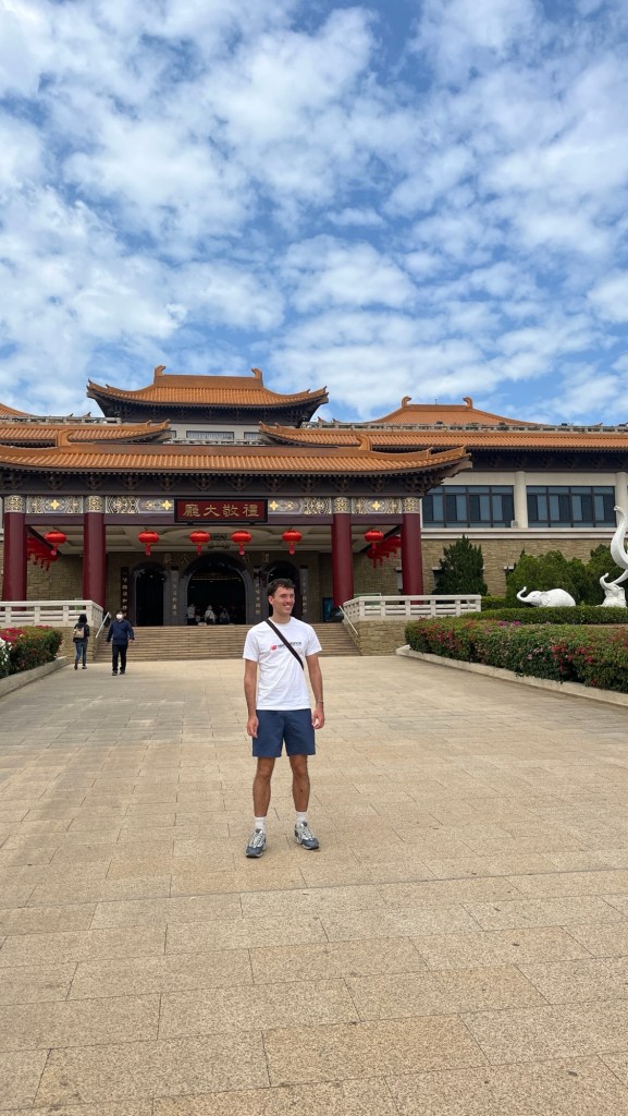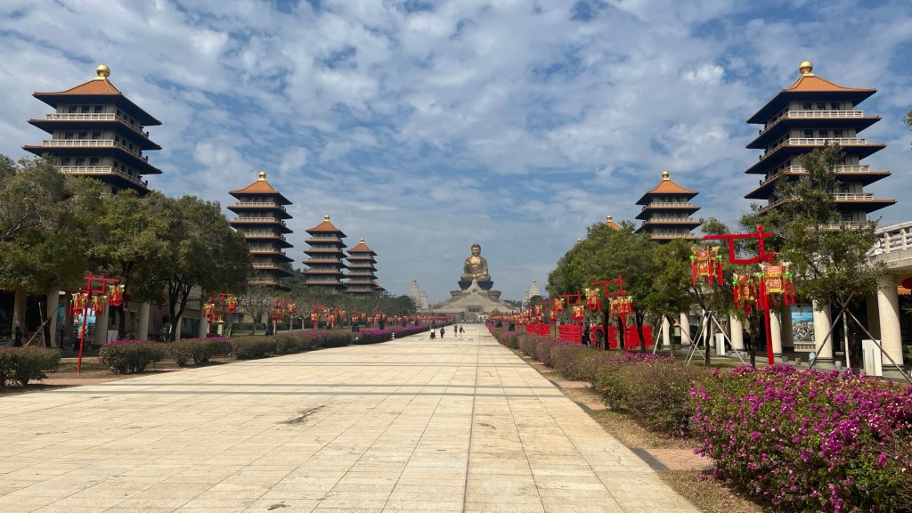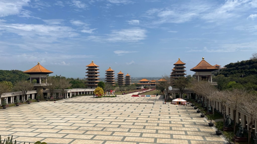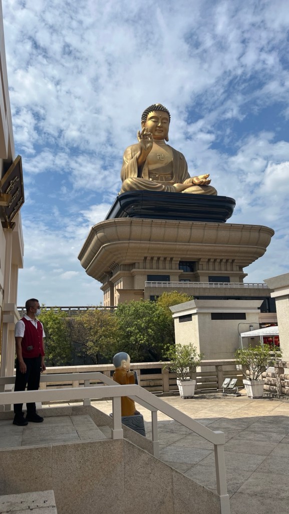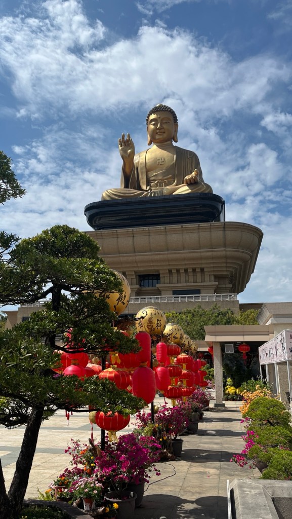 Gerade so bekommen wir unseren Express-Bus (39$TD, ein Euro) in Richtung Foguangshan, also zum Buddha-Museum, das mir auf meiner Taiwan-Bucket-List noch dringlichst fehlt. Für Papa und Julian ist es das erste Mal, außerstädtische Landschaft zu sehen, aber auch für uns andere ist es immer noch interessant, Friedhöfe, Industrie, Felder und dicke Autobahntrassen vorbeiziehen zu sehen. Ziemlich schnell überquert der Bus die Kaohsiung vom Hinterland trennende Hügelkette und fährt diese von Osten an, wo das Museum an den Berghang gebaut wurde. Eine Übersichtskarte zeigt ausschließlich das Museum, das abgetrennt vom noch größeren Kloster liegt. Die schiere Größe beeindruckt uns alle. Der große Platz hier ist angeschrägt, genau wie das ganze Areal den Berg hinauf zeigt. Obwohl die Hauptattraktion weiter hinten liegt, ist es hier wahnsinnig beeindruckend, mit Gärten, geschwungenen Dächern und Statuen, die wahlweise Löwen, Elefanten oder Buddhas zeigen.