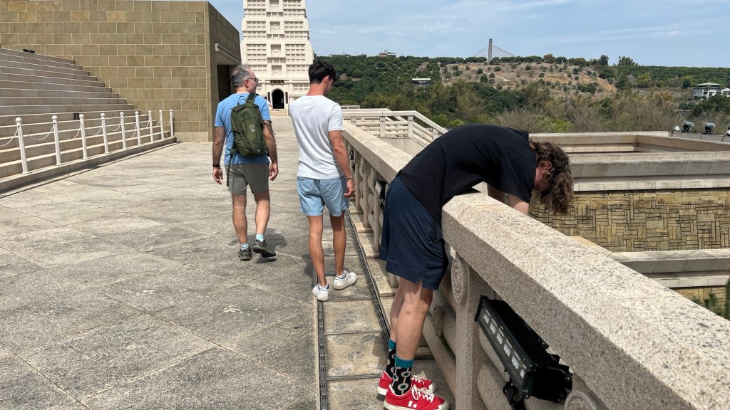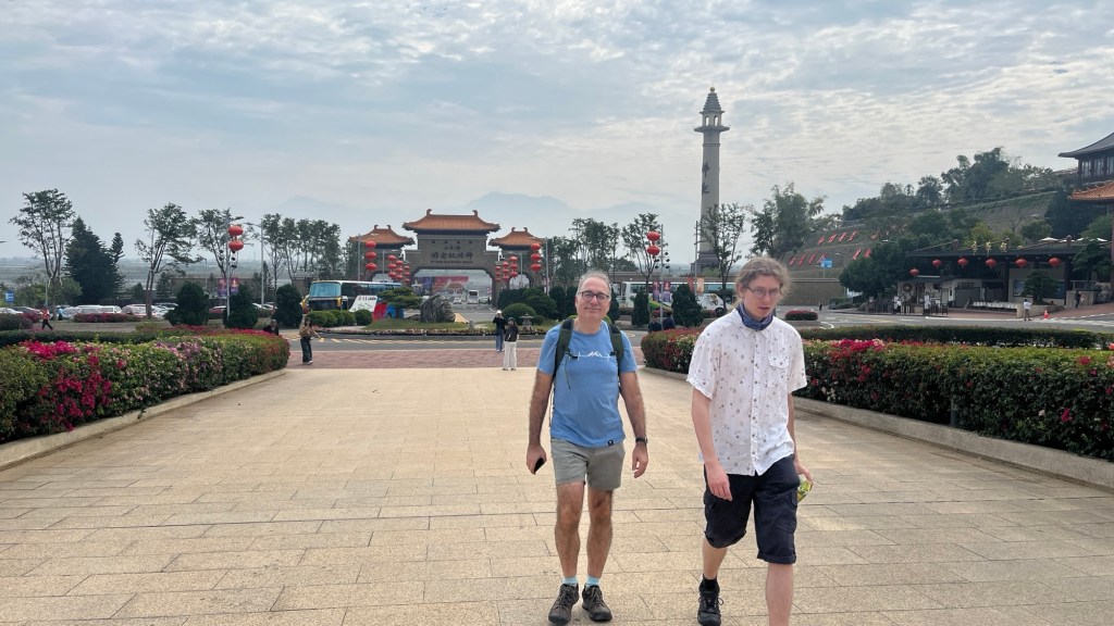 Bevor wir zurückgehen, lässt Oskar es sich nicht nehmen, einmal durch die historische Ausstellung zu huschen. Währenddessen stellen wir uns in die gleißende Sonne und bräunen uns. Julius ist gedanklich schon in seinem auf Taiwan folgenden Thailand-Urlaub, denkt zumindest viel daran und erwähnt die geplanten Touren des Öfteren. Wir touchieren den pyramidenförmigen Bau, dürfen noch ein, zwei Mal beten, und bergab gucken. Hinter dem Museum zeigt sich das flache Flussdelta des „Gaoping River“ und ich halte die dichte ländliche Besiedelung erst fälschlicherweise für Pingtung (das aber noch etwas südlicher liegt).