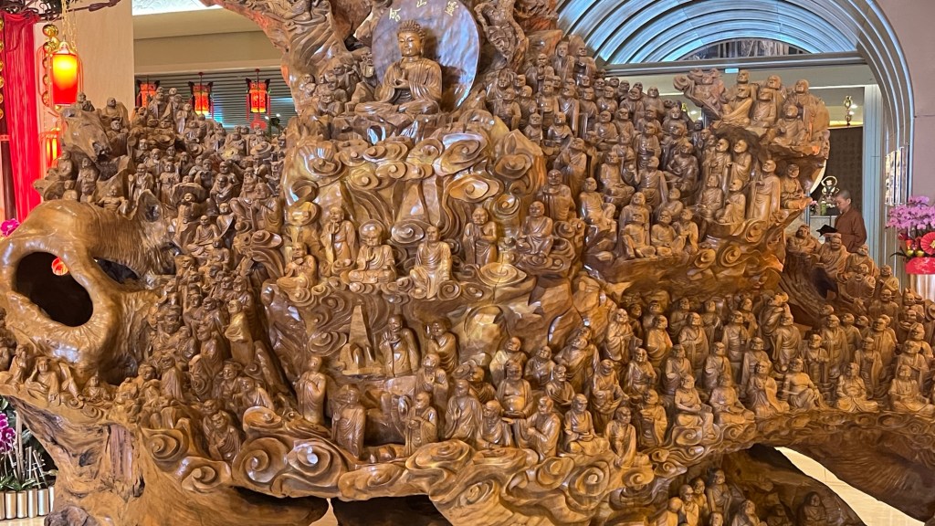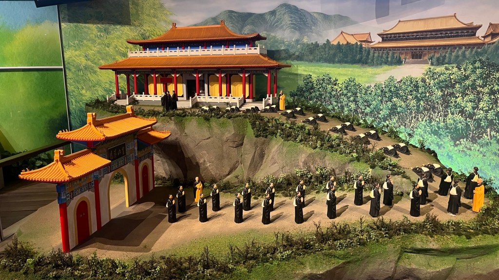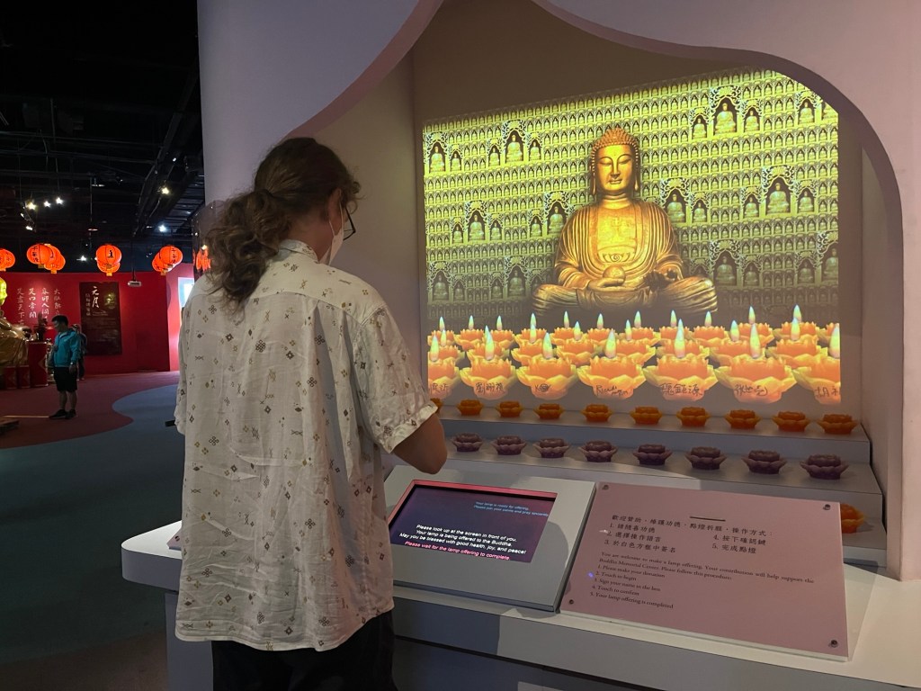 Eine weitere Ausstellung behandelt buddhistische Feste und Feiertage, gefühlt alle zu Ehren Buddhas, sei es sein Geburtstag oder einfach nur der Tag, an dem er zu Erleuchtung gelangt ist. Rote Verzierungen schmücken die Halle und ein Beamer projiziert ein sprechendes Gesicht auf eine goldenen Statue, inklusive lustigen Sprüchen und Lachern. An mehreren Stellen lassen sich kleine Rituale durchführen. Mal muss man Wasserkellen über den Schultern kleiner Statuen ausschütten, mal sich verneigen und den Segen in Form von Sprühnebelstößen akzeptieren, mal seine Unterschrift eingeben und beten. Ein alter Mann mit dunkler Haut und außerordentlich vielen Armhaaren will mir mehrmals die Hand schütteln und fragt, woher ich komme. Er ist von meiner Jungheit beeindruckt und erwähnt mehrfach, ich solle ja nun wirklich mal heiraten. „You can get 100 Taiwan Dollars, haha.“ Er fragt immer weiter, wer von meinen Begleitern jetzt wer ist, auch wie alt mein Vater ist. Kann er ihn ja selber fragen, gebe ich irgendwann zurück, leicht genervt. „You forgot? You should look at his ID card.“ Ja natürlich.