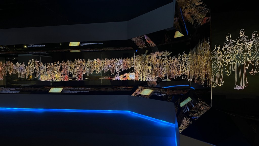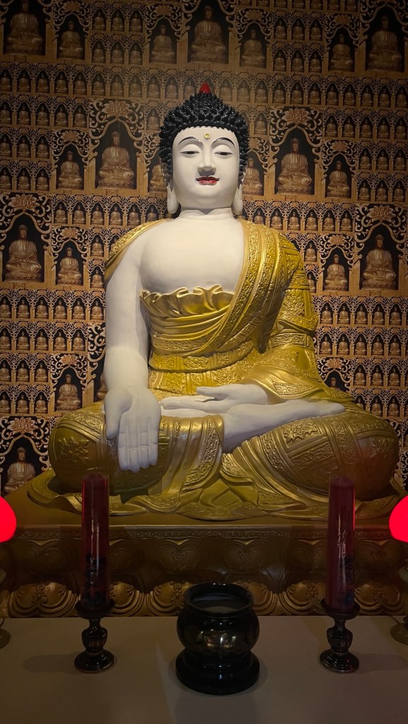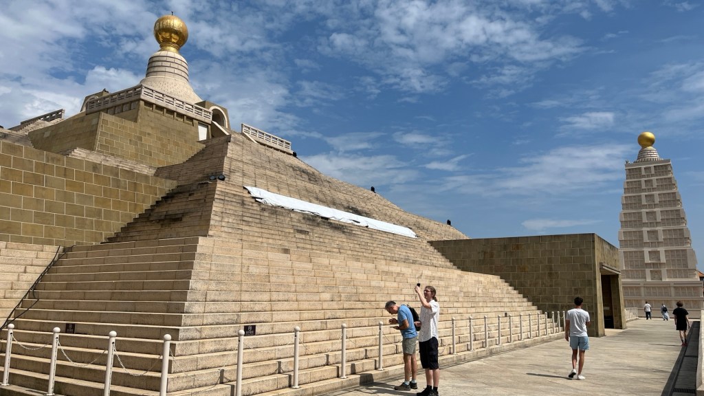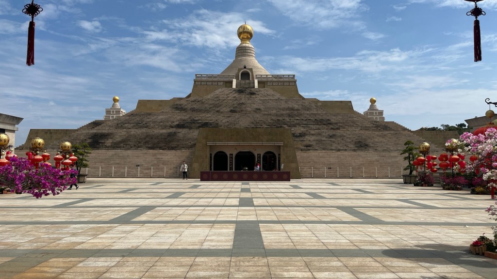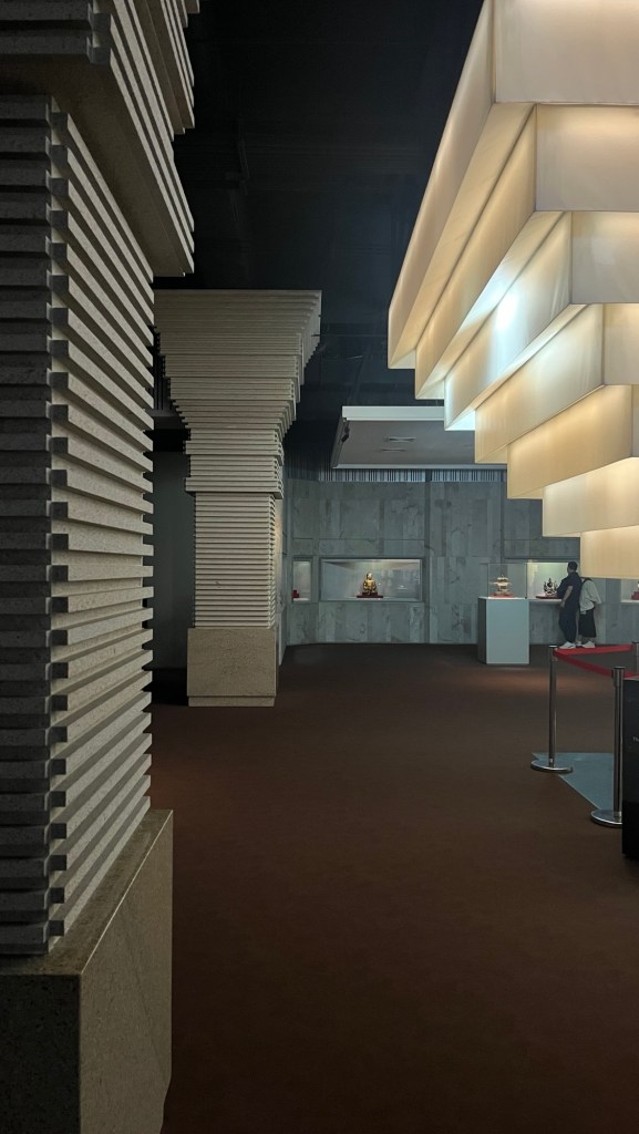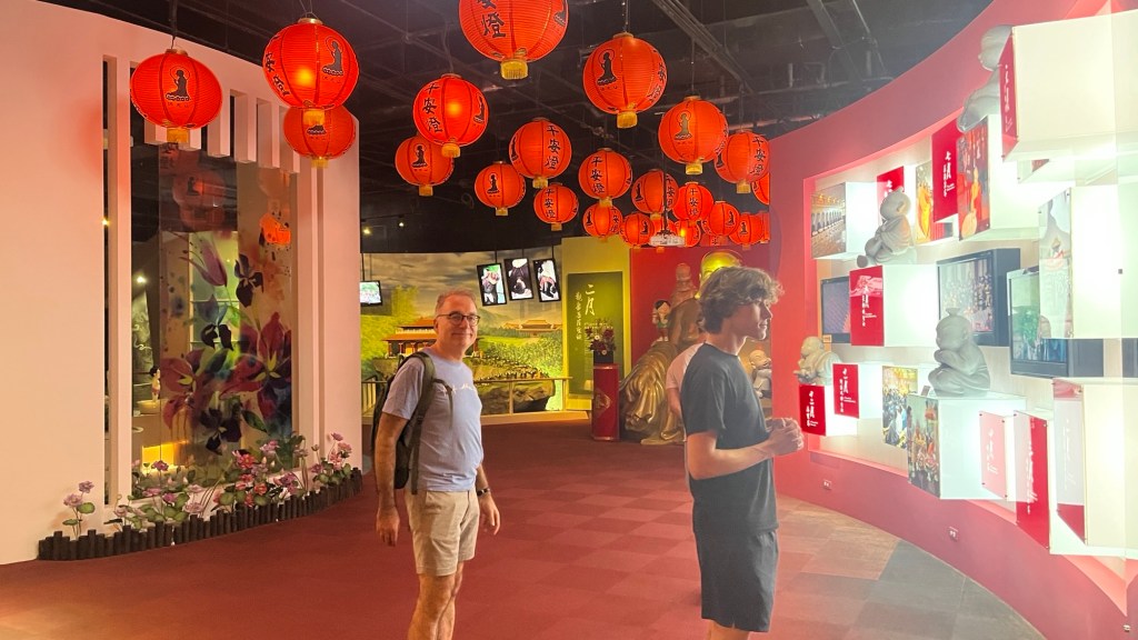 Im Infozentrum gegenüber wird ausgezeichnetes Englisch gesprochen, die glatzköpfige Frau erklärt uns aber nur kurz den Aufbau der Museen im hinteren Teil. Da wir das Video schon gesehen haben, sollen wir einfach mal selbst erkunden gehen. Also geht’s hoch. Der Buddha sitzt tatsächlich hinter dem Hauptgebäude, einer Art Pyramide mit verzierenden Türmchen. Innen gibt es eine Halle mit buddhistischer Kunst, an den Rändern zweigen Eingänge ab, die jeweils kleine Ausstellungen beinhalten.