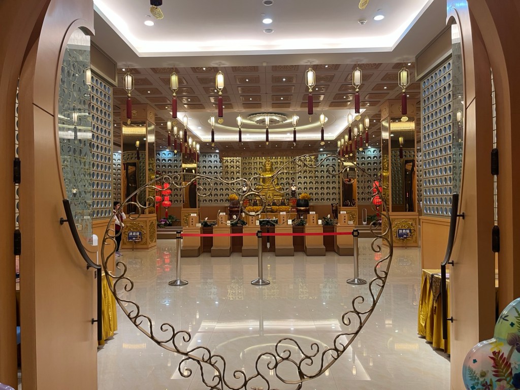 Die Haupthalle zeigt sich wie ein Einkaufszentrum. Starbucks, Souvenirläden, Toiletten und modernste Einrichtungen verleihen dem Ganzen einen kommerziellen Touch. Hier spotten wir bereits ein Restaurant (natürlich vegetarisch, passend zur Lebensweise der buddhistischen Mönche vor Ort) und gehen dann weiter vor, zum Hauptteil. Eine Straße, eine Allee, ein Platz, was ist es eigentlich? Ein solcher Bereich jedenfalls erstreckt sich hier bis zum Ende der Anlage, wo ein gigantischer Buddha in Gold thront. Acht Pagoden säumen den Straßenzug, der zwar komplett versiegelt ist, allerdings mit schönen Steinplatten und am Rand gibt es jede Menge Büsche, Bäume und rote Neujahrsdekoration. Von den vielen Pferden auf dem Gelände ganz zu schweigen. Schön ist nicht nur das weitgehend wolkenfreie Wetter, sondern auch, dass sich die Besucherzahlen generell sehr zurückhalten. Ein Dienstag Vormittag ist eben die beste Zeit, einen kostenlosen Museumsbesuch zu machen.
