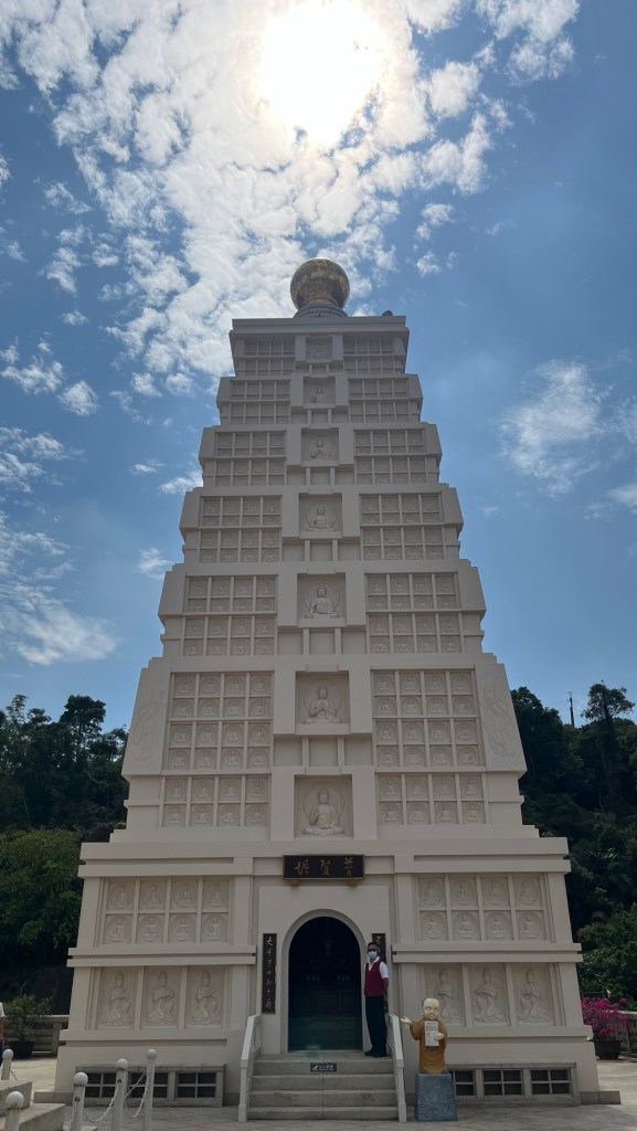 Es gibt so viel zu sehen, dass einem früher oder später die Birne raucht, also überspringen wir die letzten Informationshappen. Schließlich gibt es noch eine Kalligrafiehalle, in der wir ein paar Minuten meditieren und anschließend einen länglichen Zettel beschreiben sollen. Chinesische Schriftzeichen nachzeichnen, den eigenen Namen und das Datum ergänzen, das Endprodukt rollen wir zusammen und nehmen es mit. Die Krönung des Besuchs findet dann einige Treppen weiter oben statt, wo sich der sitzende Goldbuddha aus nächster Nähe beobachten lässt. 108 Meter hoch und 1800 Tonnen (Kupfer) schwer soll der Koloss sein, irgendwie vorstellbar. Nur wie er transportiert oder überhaupt aufgebaut wurde, würde ich gerne noch erfahren.