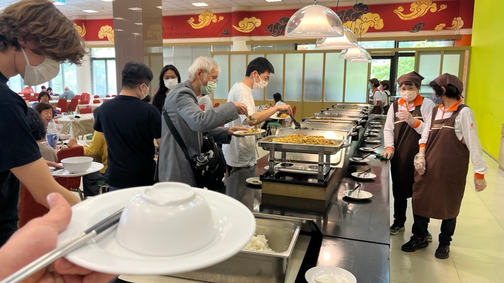 Die „Main Hall“ beinhaltet nicht nur ein vegetarisches Restaurant, nein, viel besser: ein vegetarisches Büffet, zu dem auch Anna schon geraten hat. Schlappe 750$TD (20,30€) bezahlen wir zu fünft, ziehen uns die verpflichtenden Gesichtsmasken auf und gehen an den Tisch, der unverwechselbar eine Tafel ist. Gewürzte Nudeln, Kimchi, Tofu, Pilze, Reis, leckere Soße und herzlich lächelndes Personal versüßen den Aufenthalt, nur Wasser gibt es nicht (abgesehen von einem Wasserspender auf der Toilette). Da geht Oskar aber einer ab.