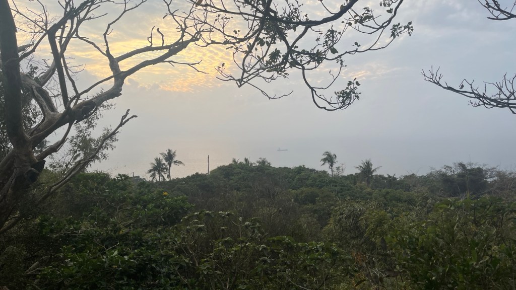 Zwanzig Minuten vor Sonnenuntergang erreichen wir den „Yazuo Pavillon“, den m.E. schönsten Ort hier. Man kann ohne großartige Sichtversperrung aufs Meer gucken, genießt lebhafte Gesellschaft von Eichhörnchen und kann auf den Bänken des Pavillons Platz nehmen. Sonne sehen wir nicht mehr, dafür bewirken die Wolken, dass die Übergangslinie von Meer und Himmel quasi nicht sichtbar ist, eine beeindruckende Szenerie. Aus riesigen isolierten Tonnen kann man sich brühheißen (und ungesüßten!) Barley-Tee abfüllen, auch Geschirr steht bereit. Einzig störend ist eine Gruppe von Hunden, die sich den Berg hinauf jagen, irgendwann aber auch verschwinden. Warm ist es definitiv, die blaue Stunde lädt zum Verweilen ein. Oskar snackt, Papa und Julius rauchen Davidoff, alle trinken Tee.