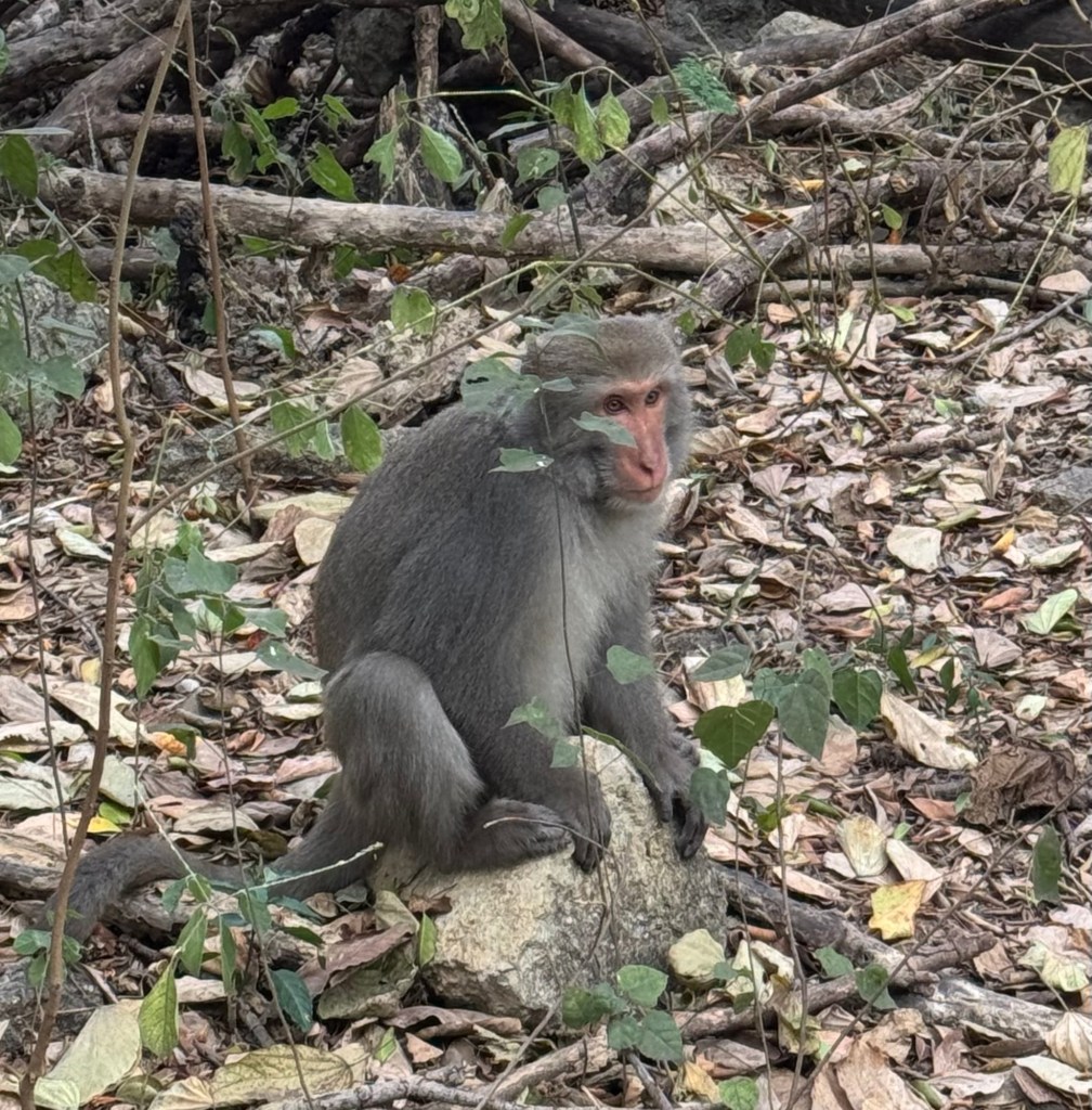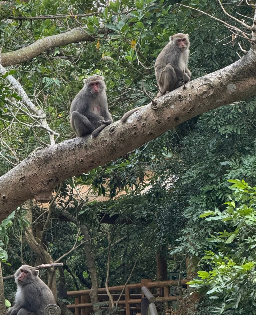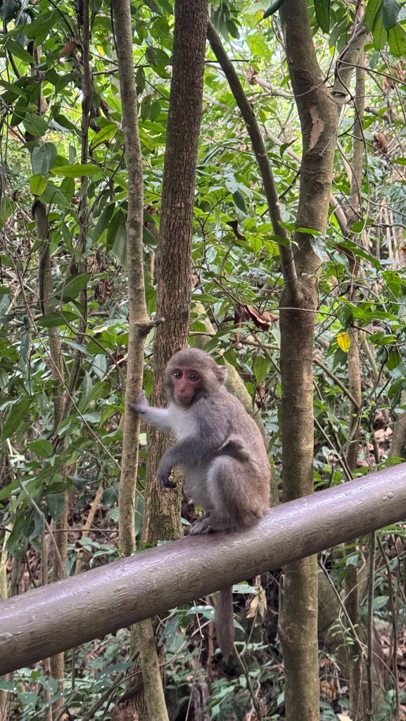 In der Stadt fahren wir mit der einzigen Tram Taiwans und besorgen Bubble Tea bei 50嵐. Papa hat den zwar noch nie probiert, lehnt aber ab und holt sich prompt beim FamilyMart daneben einen Saft, den er genauso als Bubble Tea hätte kriegen können. Leider ist der Tee wirklich nicht so bombastisch, die Verkäuferin verhaut die Hälfte der Bestellungen und gibt anderes heraus, als ihr aufgetragen wurde (qualitativ natürlich trotzdem wie immer). Mit ausreichend Zeit im Schlepptau starten wir dann schonmal unsere Abendwanderung. Gut, denn ich führe uns nicht nur einmal auf Irrwege, meine Guide-Skills scheinen nachzulassen. Selbst im Winter ist die Luftfeuchtigkeit so hoch, dass das Schweißlevel im Vergleich zu Deutschland erheblich steigt, und das kann nicht nur an den stetigen Holzstufen liegen, mit denen der Weg gepflastert ist. Während Oskar und Julian ein äußerst ausführliches und akademisches Gespräch beginnen (wobei Oskar die meisten Redeanteile hat und merklich darin aufgeht, mit jemandem über Publikationen und wissenschaftliche Themen zu sprechen), bemerken wir die ersten Affen. Im Gegensatz zu meinen Touren alleine scheinen sie hier sehr friedlich zu sein, was aber auch mit der größeren Gruppenstärke zu tun haben kann. Es riecht nach Zoo und Papa vergleicht: „Ich fühle mich wie im Botanischen Garten.“ Uns begegnen alte Taiwanesen mit umgeschlungenen Handtüchern und ab und zu überfliegt uns ein Flugzeug. Julius erzählt Papa von seinen Karriereplänen in der Schweiz und den Gründen, dahin auswandern zu wollen (alteingesessenes Parteiensystem in Deutschland, Gehalts- und Steuerfragen, er habe bisher nur Gutes über die Schweiz gehört), die genauen finanziellen Rahmendaten müssen natürlich auch genannt werden.