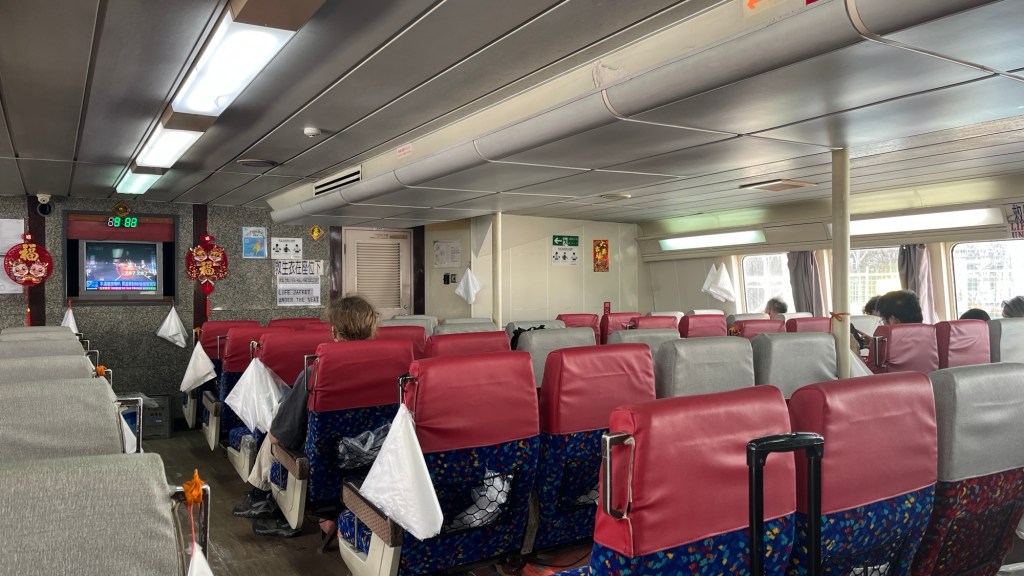Zeitlich klappt soweit alles gut, ich muss nur mal wieder mit einer Kackrinne Vorlieb nehmen und der Hafen-ATM will sich nicht unseren Kreditkarten fügen. Für Tickets auf die Insel muss man seinen Reisepass vorlegen, es gibt quasi keine Rabatte und für taiwanesische Verhältnisse ist der Spaß sogar teuer, ca. 38€ pro Person für hin und zurück. Und dann ist die Fahrt auch noch grauenhaft. Mit einer von Papas Übelkeitspillen komme ich bestens zurecht, trotz schwindelerregender Schwankungen bleibt der Magen ruhig. Julian und Oskar geht es etwas schlechter, ihre Mägen sind das einfach nicht gewohnt. Papa und Julius setzen sich sogar ans Fenster (wegen höherer Schwankamplitude eigentlich ein ungünstiger Sitzplatz), aber Letzterer ist irgendwie auf einer Mission und muss uns allen beweisen, dass er es ohne Pille schafft und keinerlei Übelkeit verspürt. Grinsend schaut er sich um und lässt kein Zeichen von Unwohlsein erkennen. Derweil habe ich in der Schiffsmitte mit Oskar ein sehr interessantes Gespräch über Beziehungen, wir beobachten dazu die auf- und niedergehenden Wellentäler. Wirklich sehr in Ordnung geht die Schreckensfahrt zu Ende.