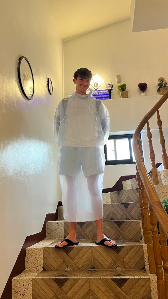 Der Regen gibt uns den Rest, alle fiebern zum Abendbrot hin. Oskar hat ein Restaurant ausfindig gemacht, das vegetarische (und hoffentlich) vegane Sachen anbietet, es liegt nur kurz hinter der Landebahn, die ich noch kein einziges Mal in Benutzung gesehen habe, obwohl es mehrmals täglich Flüge geben soll. Julius und ich in unseren „Young LA“-Hosen und Flipflops, die anderen etwas schicker, betreten wir den äußerst merkwürdigen Bau, der von vorne schmal wie ein Turm, allerdings auch hoch ist und so weit nach hinten geht, dass es sich volumentechnisch schon um ein Schiff handeln könnte. Der Speiseraum ist riesig, aufgebaut wie eine Schulmensa mit runden Tischen, hier ist also Platz für die ganzen Touris, die zu Peakzeiten auch die Rollermassen mieten. Die Speisekarte ist vielfältig und teuer, wir bestellen trotzdem alles Mögliche. Julian wird ein fleischhaltiges Tofugericht gebracht und ich kann direkt nochmal verhandeln üben: Nicht locker lassen, lautet die Devise. Ansprechen, dass wir etwas anderes bestellt haben und abwarten, wie die Reaktion ausfällt. Die Kellnerin holt ihre Chefin, die ohne zu zögern sagt: „This one, it’s free for you“. Dann kommt sogar noch eine vegetarische Variante, und der Tisch ist übervoll. Julius‘ und meine Tintenfischmünder und -hodensäcke sind stark gesalzen, generell sind die Portionen extrem groß. Mit gefüllten Mägen verlassen wir das Lokal. Julius teilt noch kurz allen mit, wie hoch sein jüngstes Gehalt ist, dann brechen wir in Richtung Therme auf.