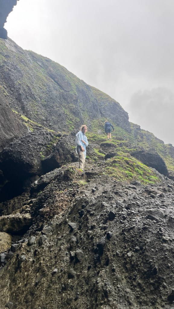 Leider regnet es, als wir die Rundtour weiter fortsetzen, die Luft kühlt ab. Ein kleiner Wanderweg ist mittlerweile nicht mehr gesperrt, die Holztreppen über einen Bergsattel schieren Eindruck.