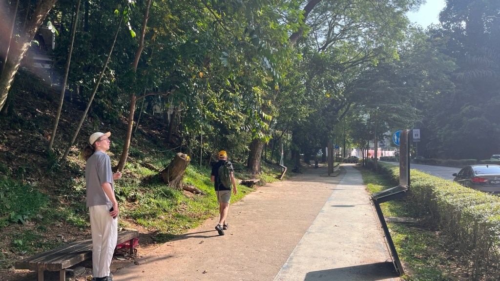 Eine halbe Tube vorsorgliche Sonnencreme später machen wir uns auf den Weg, eine Komoot-Stadtroute zu begehen. Diese führt uns zuerst durch die von gestern Abend bekannten Straßen, wobei das erste Abenteuer im Linksverkehr und den für Autos und Fußgänger unterschiedlichen Ampelphasen besteht. Bald gelangen wir dann aber an den ersten Stadt-Dschungel, der Ruhe mit sich bringt und offensichtlich eine Bereicherung für die versiegelten Flächen rundherum darstellt.