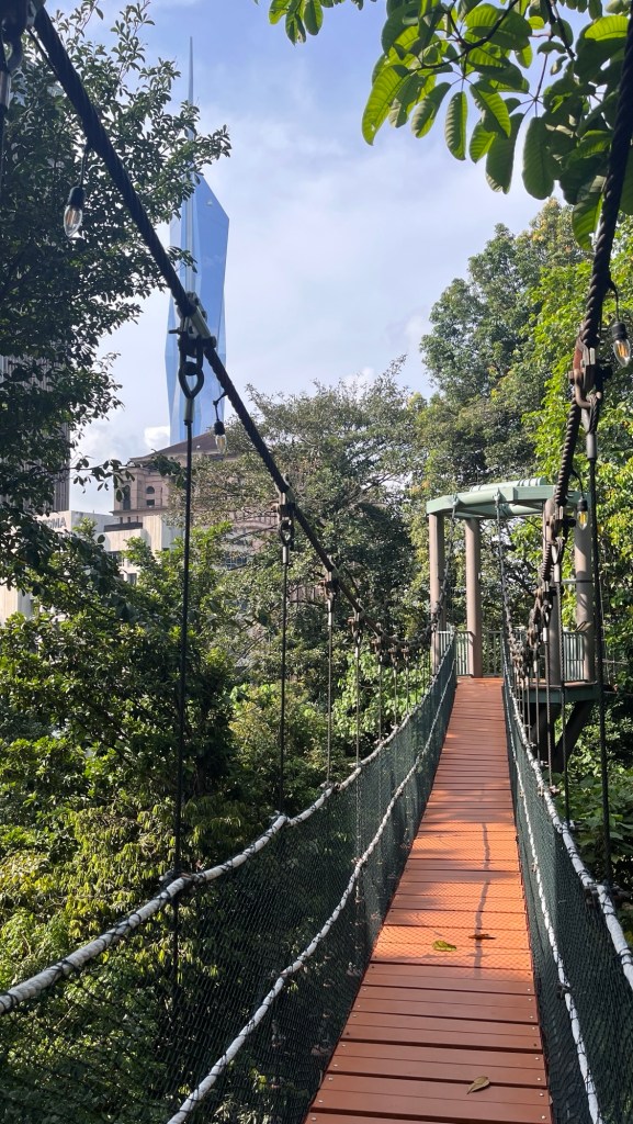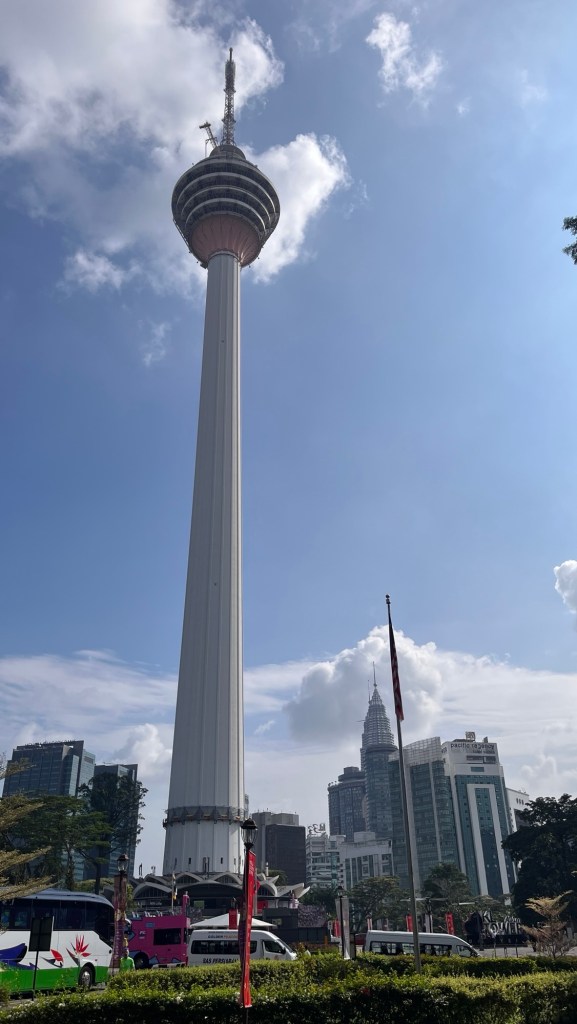 Die Route führt uns durch ebendiesen, und trotz des relativ hohen Preises (40 Ringgit (8,70€) pro Person) machen wir das, es lohnt sich. Genau wie in meiner Kaohsiunger Anfangszeit schwitzt man sich nach wenigen Höhenmetern den halben Wasserhaushalt aus, egal ob im Schatten oder in der Sonne. Belohnt wird man mit versteckten Blicken auf einem ziemlich leeren Baumwipfelpfad. Auf die Hängebrücken dürfen maximal zehn Personen gleichzeitig, jedes Türmchen ist zudem nach einer Baumart benannt, mit Begründung. Über die malaiischen Wörter finden wir heraus, dass der Name des nebenanliegenden Fernsehturms, dem „Menara Kuala Lumpur“, nur dessen Gebäudetyp beschreibt, einem Turm. Diesen Namenszusatz tragen folglich auch die „Menara Berkembar Petronas“, die Petronas Zwillingstürme nicht viel weiter hinten. Jedenfalls endet der Erlebnisweg mit einem Tor, das direkt auf den erwähnten Fernsehturm zeigt. Er ist 421 Meter hoch und ragt gewaltig in die Höhe, fast schon angsteinflößend.