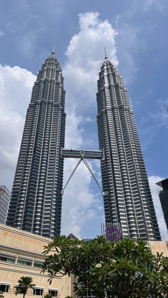 Es ist nicht weit bis zu den Patronas, die übrigens nach dem staatlichen Öl- und Gaskonzern benannt sind. Wenn ich so darüber nachdenke, passt die Architektur auch ganz gut dazu: der gesamte Komplex ist von unten nach oben gestreift, ein weißer und ein schwarzer pro Stockwerk. Dabei reflektiert die Fassade nach Möglichkeit und zeigt trotz strahlendem Image so wenig Farbe wie möglich. Die Symmetrie wirkt auf mich irgendwie brutal, eine gelenkgestützte Brücke verstärkt den Eindruck nur.