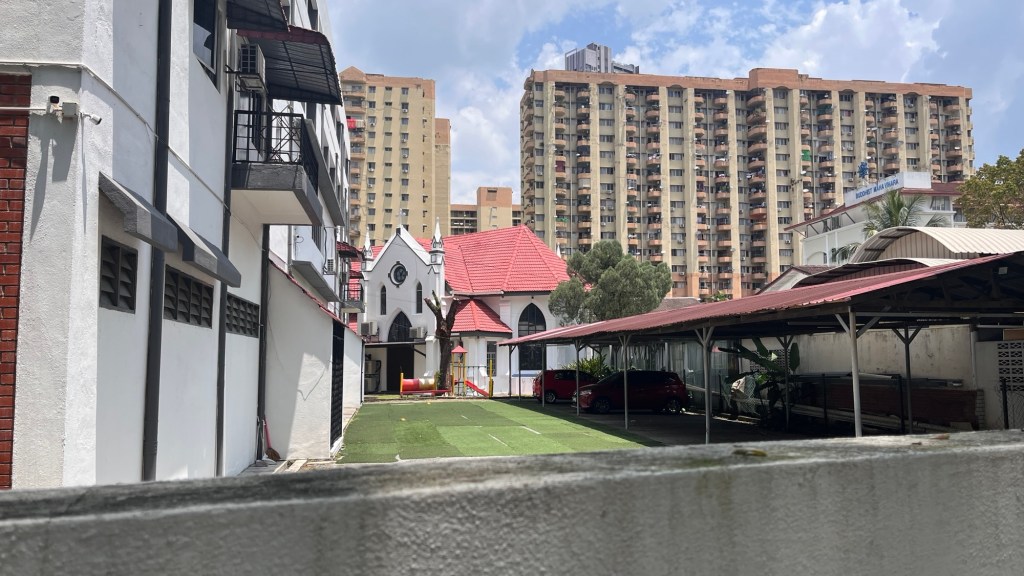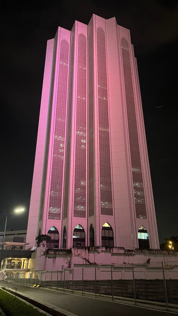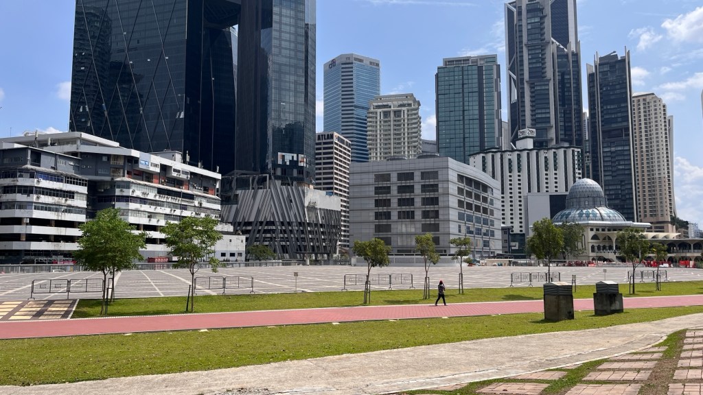 Direkte Sonneneinstrahlung lässt sich kaum aushalten, so bin ich froh, dass Komoot uns über versteckte Abkürzungen in den Schatten der Hausgiganten führt. Für so etwas ist die App Google gegenüber echt im Vorteil. Unter den in den Himmel zeigenden Business-Fassaden fühle ich mich so, wie ich mir New York vorstelle, zumindest im Verhältnis zur Architektur. Immerhin ist nicht alles so streng gerastert, und schattenspendende Zedern nehmen die Brutalität etwas raus. Trotzdem merke ich schon anhand meiner geschossenen Fotos, wie das Stadtviertel aufgebaut ist. Habe ich durch den Blog eine bessere Beziehung zu Querfotos aufgebaut, so machen hier doch nur die vertikalen wirklich Sinn. Wie viele Büroflächen in der Gegend wohl untergebracht sind? Unzählige, ganz sicher auch viele leerstehende. Die einzigen Hinweise auf das Geschehen hinter den Spiegelfenstern geben posende Schriftzüge, etwa von der „AmBank“, der „MayBank“ oder unzuordbare Logos.