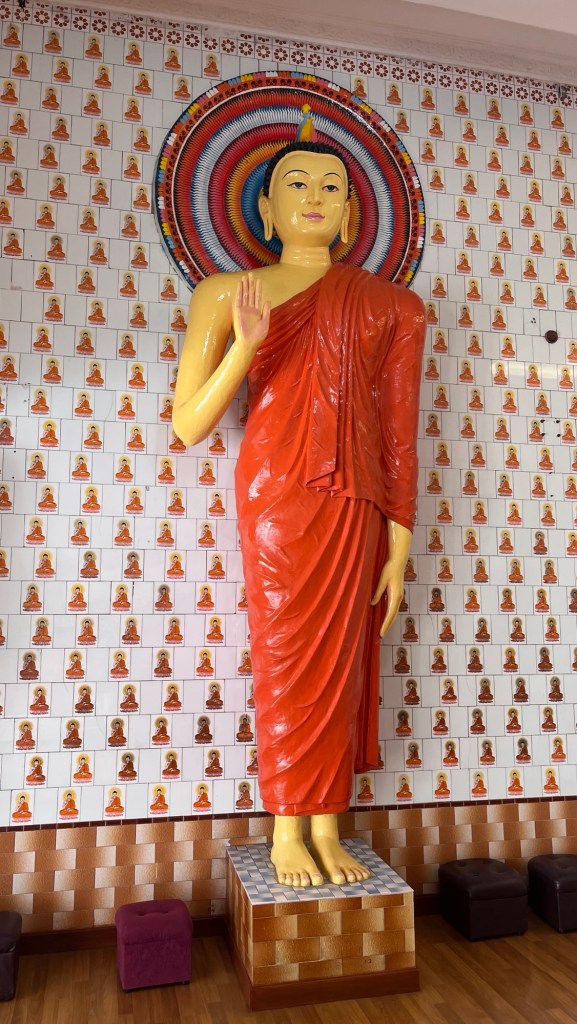 Wieder in der Hitze, finden wir einen geschlossenen Hindu- und einen geöffneten Buddhistentempel. Letzterer gebietet, ohne Schuhe einzutreten, in einem mittelgroßen Raum wird ein sehr alter Mann in orangenem Gewand von einer Pflegerin behandelt. Eine liegende und eine stehende Statue geben dem Raum zusätzliche Richtung, interessant sind außerdem die Motiv-Fliesen. Die Variante hier ist ziemlich krass, aber grundsätzlich kann ich mir gut vorstellen, bemalte Fliesen in meinem Bad zu haben.