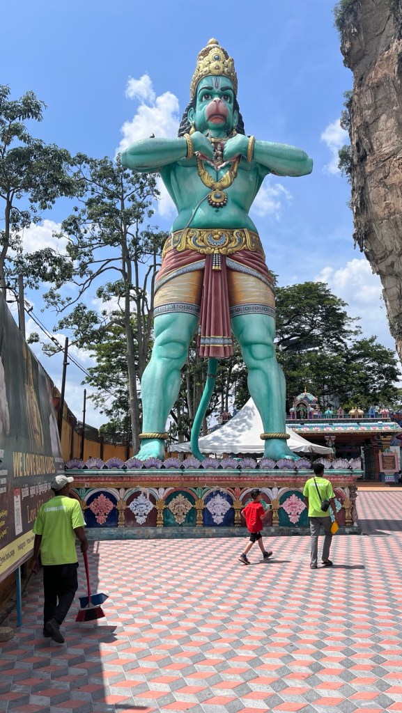 Die Hauptattraktion zeigt sich aber wirklich erst an der Treppe. Eine riesige vergoldete Statue, zumindest höhentechnisch dürfte sie größer als der Kaohsiunger Goldbuddha sein, hält vor dem höhergelegenen Höhleneingang Wache, eine Art Seil über die Schultern gelegt. Google nennt sie „Lord Murugan Statue“, irgendeine Figur aus dem Hinduismus. Auch hier sind jede Menge Affen unterwegs, die man zwischen den affigen Touristen fast übersieht.