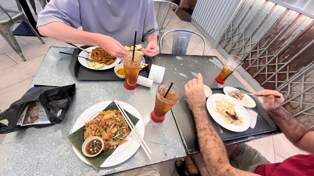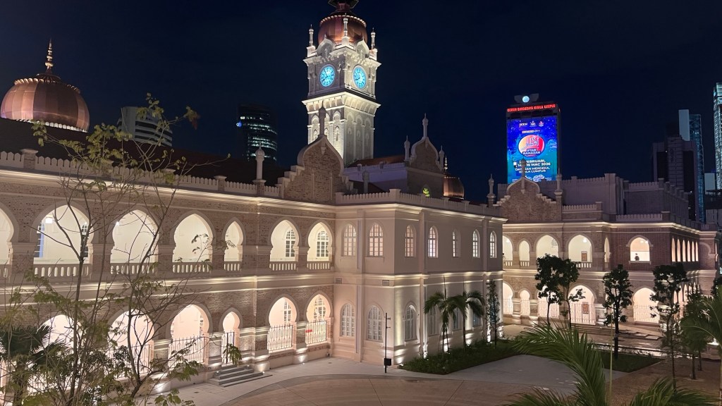 Für einen Sonnenuntergang reicht es nicht, allerdings ziehen wir zum Essen noch einmal los. In der Marktgasse vor unserer Tür gibt es Trüffelpommes, danach entdecken wir erst, dass der eigentlich Markt im Haus nebenan stattfindet. Ich besorge weitere Postkarten, dann setzen wir uns in den Foodcourt und bestellen unterschiedliche Kost, wobei alles irgendwie indisch geprägt ist. Anschließend schauen wir uns das „Sultan Abdul Samad Building“ genauer an. Am Platz von gestern Abend kann man kostenlos in das steril weiß gehaltene Kolonialgebäude eintreten. Bei Nacht macht die Beleuchtung es zum Instaspot, außerdem locken Restaurants mit Plätzen im großzügigen Flur.