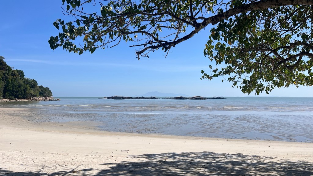 Am Strand liegen viele Nadeln, vor der Küste ragt ein Felsen knapp aus dem Wasser. Am Horizont zeigt sich ein Containerschiff, ansonsten gibt es auch Fischerboote und kleine Shuttles, die regelmäßig anlanden und Touristen absetzen oder mitnehmen. Papa versteht nicht, wieso jemand diese Wanderung umgehen wollen würde, und obwohl ich es ähnlich sehe, werden mir sofort viele Leute bewusst, die sich genau für das zu fein wären. Mur fällt außerdem auf, dass ich gerade zum allerersten Mal auf den indischen Ozean blicke, oder jedenfalls auf seinen Ausläufer, den Golf von Bengalen. Bengalen dürfte laut Maps eine Region nordöstlich oder im Nordosten von Indien sein, vielleicht Bangladesch? Geradezu nach Westen und geradezu nach Süden würde man zuerst auf Sumatra stoßen, Sky’s Heimat übrigens. Eine Liftlinie nach Nordwesten führt nach Sri Lanka bzw. nach Indien, ein direkter Blick nach Afrika bleibt mir verwehrt. Worauf man also schaut, wenn man sein Auge zum Horizont wirft, ist die Straße von Malakka, eine der wichtigsten Schifffahrtsrouten der Welt. Zu dritt diskutieren wir ihre Relevanz für die Weltwirtschaft, gerade ja ein populäres Thema. Noch vor dem Panamakanal dürfte sie sich mit dem Suezkanal um Platz eins streiten, was die Wichtigkeit angeht. Das Umfahren dürfte nämlich schwierig sein, zwischen Sumatra und Java gibt es nicht besonders viel Platz.