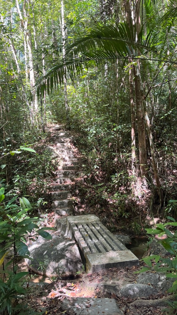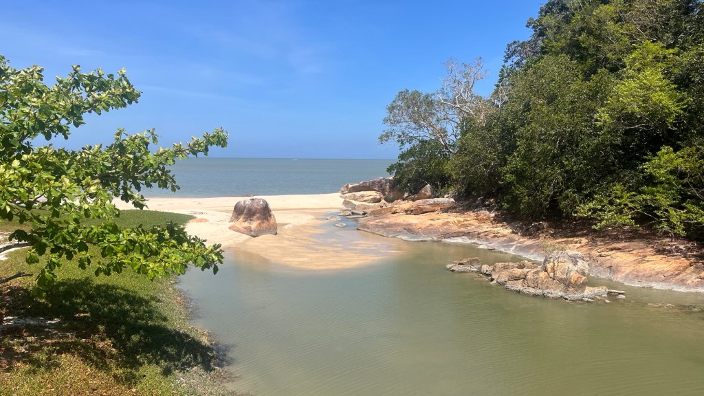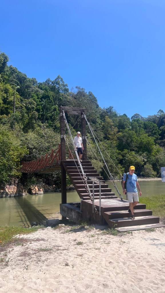 In den 50 Minuten begegnen wir einzelnen Briten und Malaysiern, Holzpavillons, deutschen Fußballstickern, rutschigen Betonstufen und jede Menge Wurzeln. Es ist idyllisch, aber was passiert, wenn sich irgendjemand auf dem Beton den Kopf anschlägt, will ich mir gar nicht ausmalen. Der Schildkrötenstrand ist immerhin eine offene Fläche, die bereits durch die Baumlandschaft schimmert, zuerst als kiesiger Sumpf, dann als gleißende Sandfläche, umströmt durch ein Flüsschen. Den Zugang markiert mal wieder eine Hängebrücke, dahinter ist bis auf Holzbänke und ein Strandwächterhäuschen weitgehend unberührt.