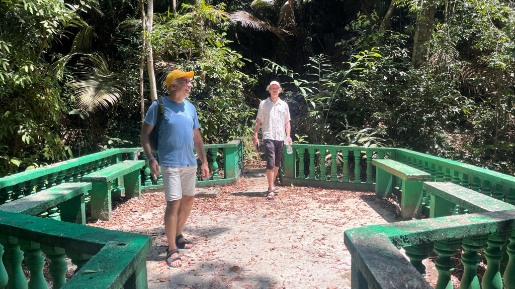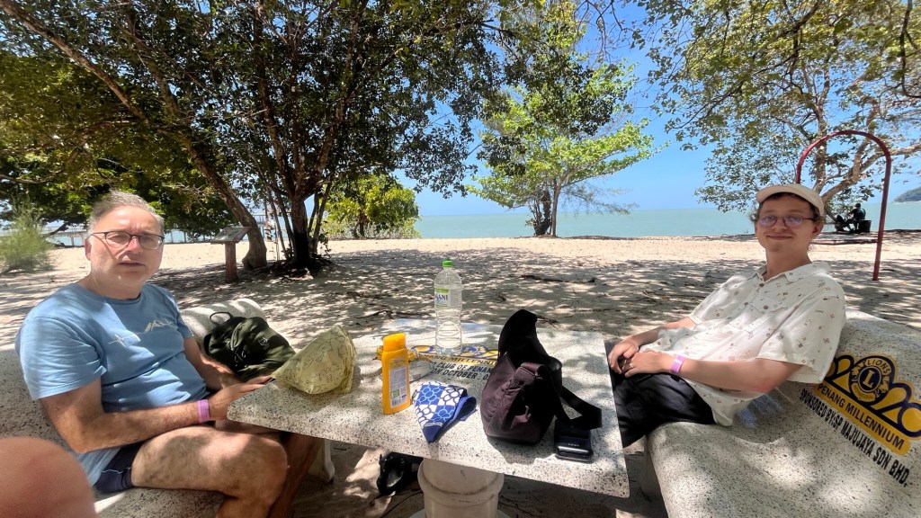 Am letzten Tag in Penang, und letzten Tag gemeinsam mit Papa, besuchen wir noch die Westküste der Insel. Dazu nehmen wir uns einen Linienbus, der zwischen den Jetis und den Dorfstrukturen abseits George Town‘s verkehrt. Eine Stunde benötigt man, wobei der größte Teil im staureichen George Town verbracht wird, gefolgt von einer kurvenreichen Küstenfahrt im Norden. Mitten in der Hitze, zwischen unbelebten Wohnblöcken und geschlossenen Street-Food-Ständen werden wir abgesetzt, nur am Parkeingang wird man belagert. Alle paar Meter steht ein Verkäufer oder eine Verkäuferin und ruft eine der üblichen Parolen. Wie in den Philippinen kostet jeder Nationalpark Eintritt, und das nicht zu wenig. 50 (11€) Ringgit zahlen Ausländer, ich als taiwanesischer Student immerhin nur 20 (4,30€).