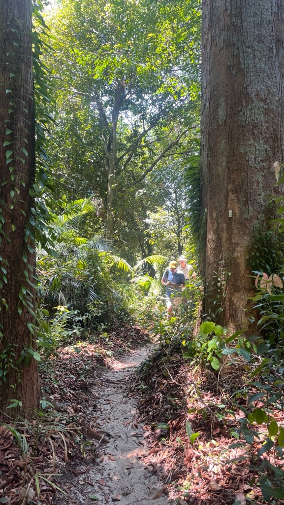 Als das Wasser ausgeht, verlassen wir den Strand wieder, wandern zurück. Wieder begegnen wir Briten, die entweder fast verirrt sind oder einnickend im Pavillon liegen und sich wundern, dass sie keine wilden Tiere sehen. Wir haben mehr Glück: Nach lautem Rascheln sehe ich zum ersten Mal eine Affenart, deren Fell gegen schwarz geht und deren Kopfhaare weiße Partikel aufweisen, systematisch. Die zwei Tiere sind eindeutig größer als die Javaaffen von den Batu Caves, auch als die Makaken in Taiwan. Dafür sind die schwarzen Kletterer schüchtern und schwingen sich sofort weg, als wir ihnen näher kommen. Im Dschungel zu wandern ist schon geil, auch wenn nicht jede Route so abenteuerlich ist wie auf dem Penang Hill vorgestern. Dicke Baumstämme, exotische Tiere und ein so dichtes Dickicht, dass man ohne Pfad sofort die Orientierung verlieren würde. Zwischendurch höre und pfeife ich mal wieder Musik, manche philippinischen Ohrwürmer gehen mir einfach nicht aus dem Kopf.