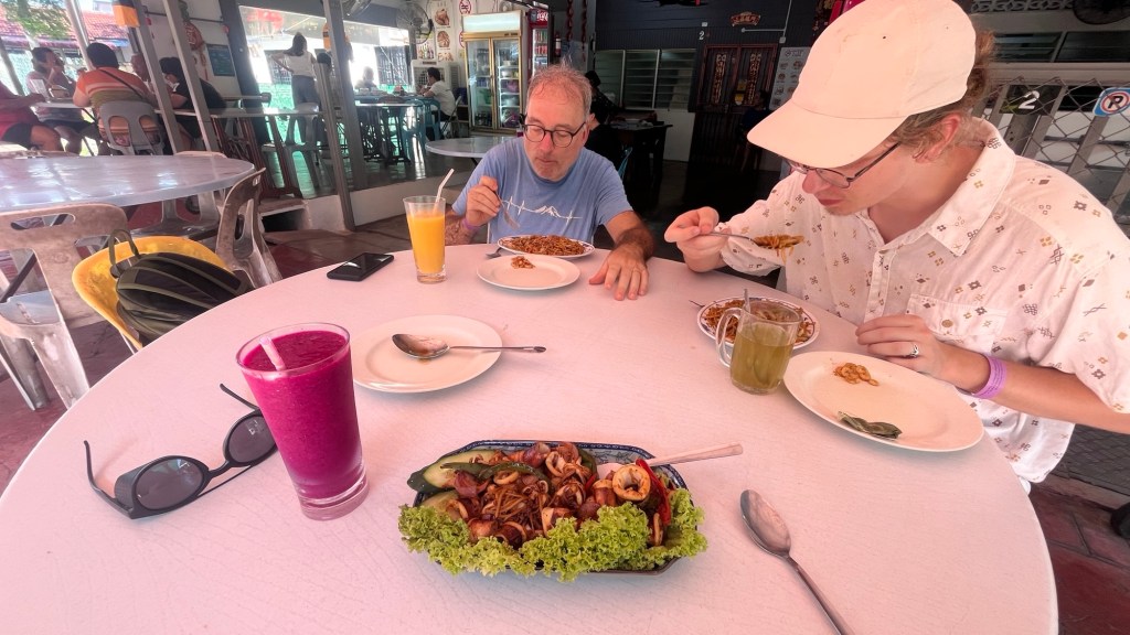 Der Ort vor dem Nationalpark-Eingang bietet immerhin ein Seafood-Restaurant, in dem es eine große Auswahl an weder chinesisch noch indischem Essen gibt. Hinterher kämpfen wir uns durch die Betonwüste zur Hauptstraße vor, denn (warum auch immer) an Ramadan fahren die Linienbusse weiter hinten ab. Der Linksverkehr macht mir immer noch zu schaffen, auch nach einer Woche im Land gucke ich noch ab und zu unachtsam zur falschen Seite, bevor ich die Straße queren will. Ein Glück, dass mir das hier und nicht in George Town passiert.