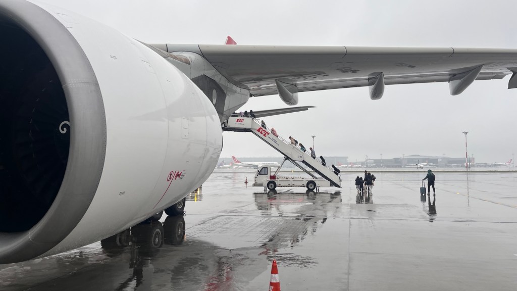 Dann stoppen wir im sehr nebligen Istanbul, quetschen uns durch die Kontrollen mit extremer Passagierlast. Meinen Standpunkt auf Google Maps wieder in Europa zu sehen, fühlt sich sehr befremdlich an, irgendwie falsch. Auf das Berliner Wetter habe ich noch gar nicht geschaut, und wenn mir Istanbul so ansehe, will ich das auch gar nicht. Enttäuscht werde ich so oder so. Tatsächlich werden wir per Bus zum Flugzeug gefahren und für meine Verhältnisse ist es eisig kalt, als alle Gäste an die Rampe drängen.