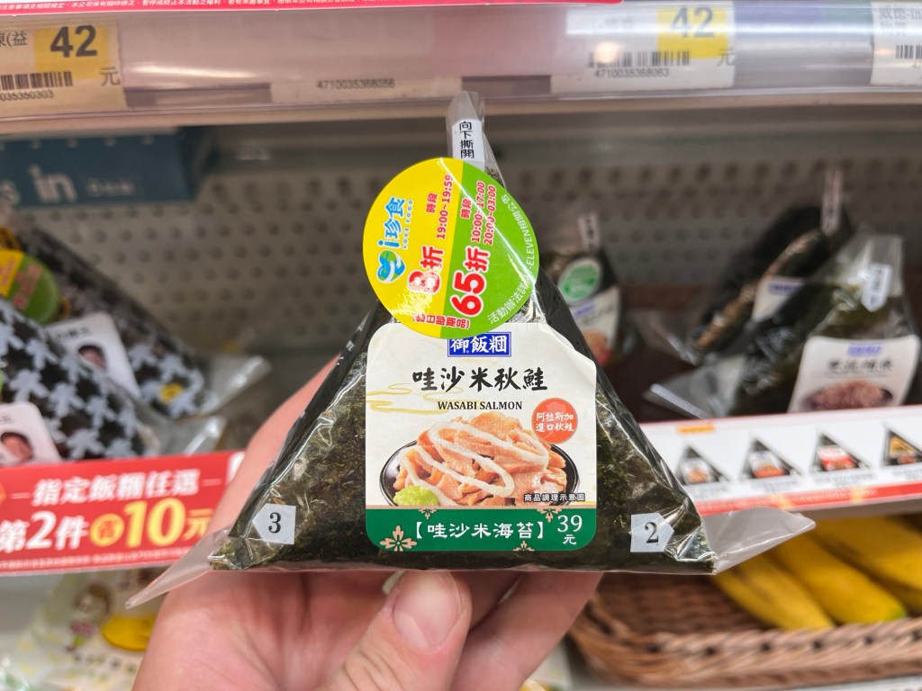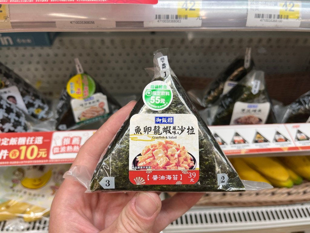 Die ikonischen Reisdreiecke (飯糰 „Fàntuán“ heißt eigentlich Reisball, aber darauf kommt es nicht an) stammen gar nicht aus Taiwan, aber das tun die Stores ja auch nicht. Die normale Größe ist perfekt, um einen kleinen Snack abzubilden, dazu handelt es sich um vergleichsweise gesunde Zutaten. Die Hülle ist überall gleich: Noriblätter, die man beim Auseinanderziehen der sicherlich patentierten Verpackung um das Hauptvolumen wickelt, und der Reis, der das Kernprodukt umgibt. Wie gewohnt, gibt es eine sehr große Auswahl an Fleisch, hauptsächlich pork und chicken, dazu kann ich bekannterweise keine Aussage treffen. Es gibt aber jede Menge Fisch, sowie Veggie-Fleischersatz und sogar vegane Pilzfüllungen. Die Preise variieren zwischen 30$TD (0,80€) und 60TD (1,60€), je nach Füllung. Ich zähle nicht alle auf, einige gute heißen aber: „Wasabi Salmon“, „Buttered Salmon & Soy Sauce“, „Tuna“, „Crawfish & Pollack Roe“. Mein absoluter Liebling ist allerdings „Crayfish & Salad“, nichts schlägt den leicht sauren, scharfen Geschmack dieses 35$TD-Produkts. Einziges Manko sind die Verpackungen, die manchmal perfekt funktionieren, manchmal aber auch wichtige Flächen der Noriblätter zurückhalten.